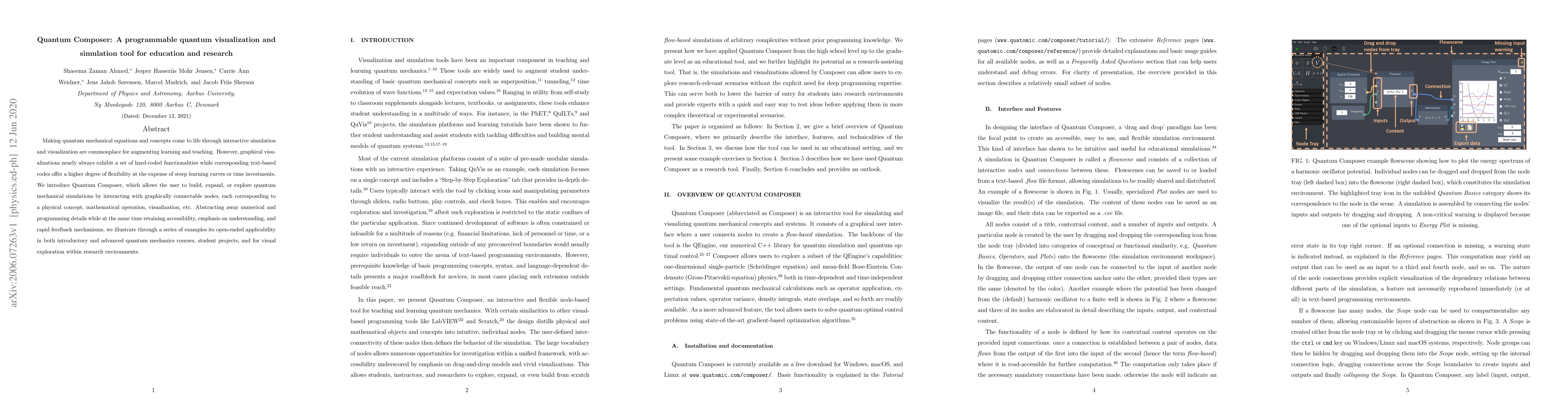 Quantum Composer is a graphical tool for constructing quantum mechanical simulations through connectable nodes, balancing accessibility with flexibility. It facilitates both educational and research applications by providing interactive visualizations while abstracting complex programming details.