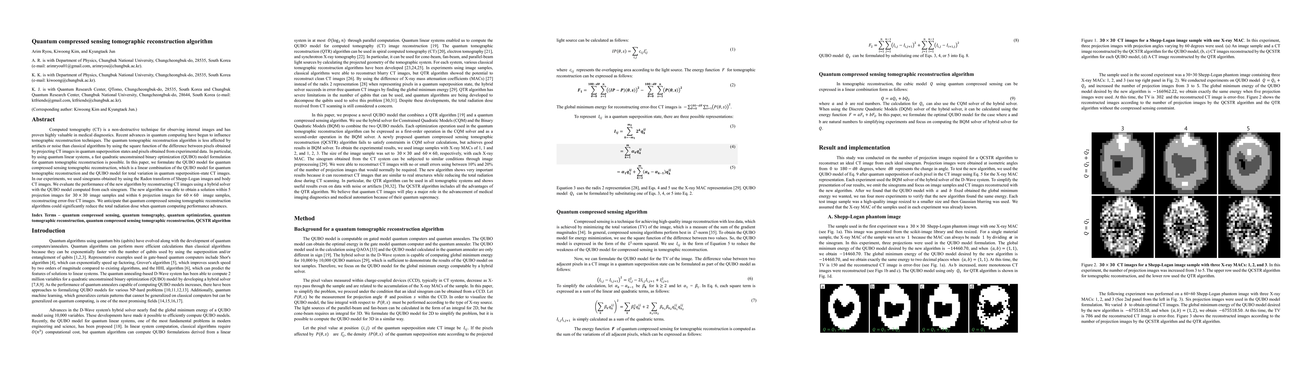 The paper proposes a quantum compressed sensing tomographic reconstruction algorithm, formulated as a QUBO model combining quantum tomographic reconstruction and total variation in quantum superposition-state CT images.