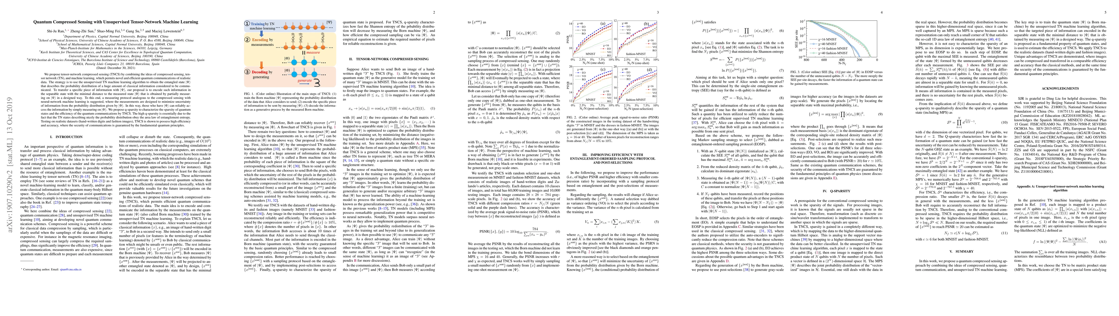 This paper proposes tensor-network compressed sensing (TNCS) that integrates compressed sensing, tensor networks, and unsupervised machine learning for efficient quantum communication. It uses tensor networks to describe the probability distribution of large datasets and employs a measuring protocol to minimize uncertainty, ensuring high efficiency and security in quantum communications.