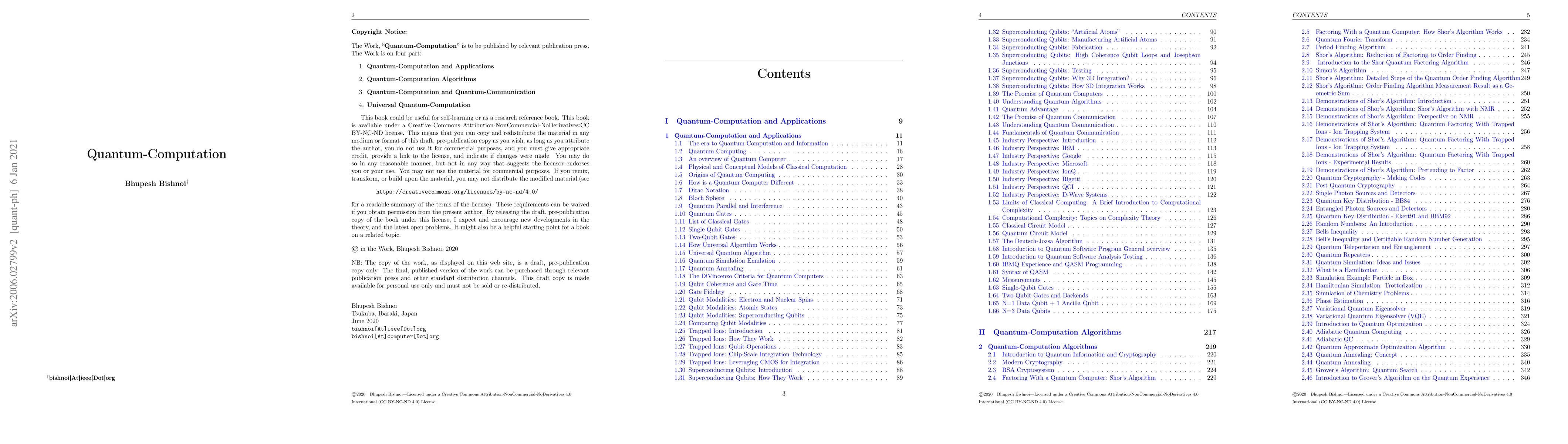 In this research notebook in the four-part, quantum computation and applications, quantum computation and algorithms, quantum communication protocol, and universal quantum computation for quantum engineers, researchers, and scientists, we will discuss and summarized the core principles and practical application areas of quantum computation. We first discuss the historical prospect from which quantum computing emerged from the early days of computing before the dominance of modern microprocessors. And the re-emergence of that quest with the sunset of Moore's law in the current decade. The mapping of computation onto the behavior of physical systems is a historical challenge vividly illustrate by considering how quantum bits may be realized with a wide variety of physical systems, spanning from atoms to photons, using semiconductors and superconductors. The computing algorithms also change with the underline variety of physical systems and the possibility of encoding the information in the quantum systems compared to the ordinary classical computers because of these new abilities afforded by quantum systems. We will also consider the emerging engineering, science, technology, business, and social implications of these advancements. We will describe a substantial difference between quantum and classical computation paradigm. After we will discuss and understand engineering challenges currently faced by developers of the real quantum computation system. We will evaluate the essential technology required for quantum computers to be able to function correctly. Later on, discuss the potential business application, which can be touch by these new computation capabilities. We utilize the IBM Quantum Experience to run the real-world problem, although on a small scale.