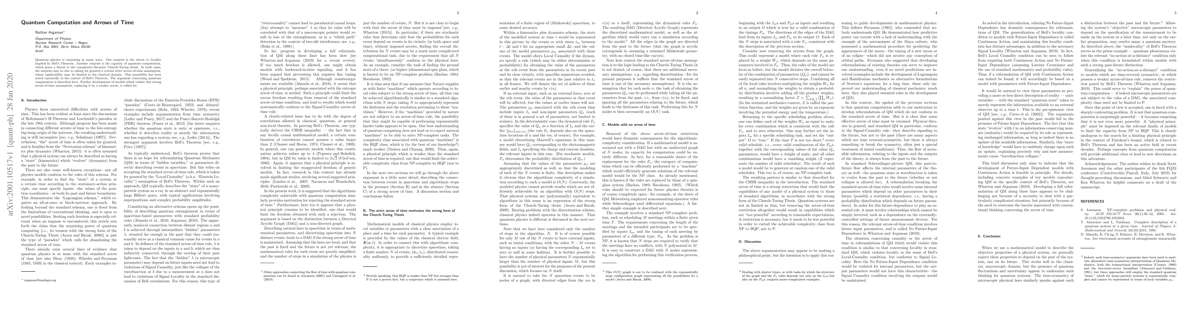 Quantum physics is surprising in many ways. One surprise is the threat to locality implied by Bell's Theorem. Another surprise is the capacity of quantum computation, which poses a threat to the complexity-theoretic Church-Turing thesis. In both cases, the surprise may be due to taking for granted a certain strict arrow-of-time assumption, whose applicability may be limited to the classical domain. This possibility has been noted repeatedly in the context of Bell's Theorem. The argument concerning quantum computation is described here. Further development of models which violate this strong arrow-of-time assumption, replacing it by a weaker arrow, is called for.