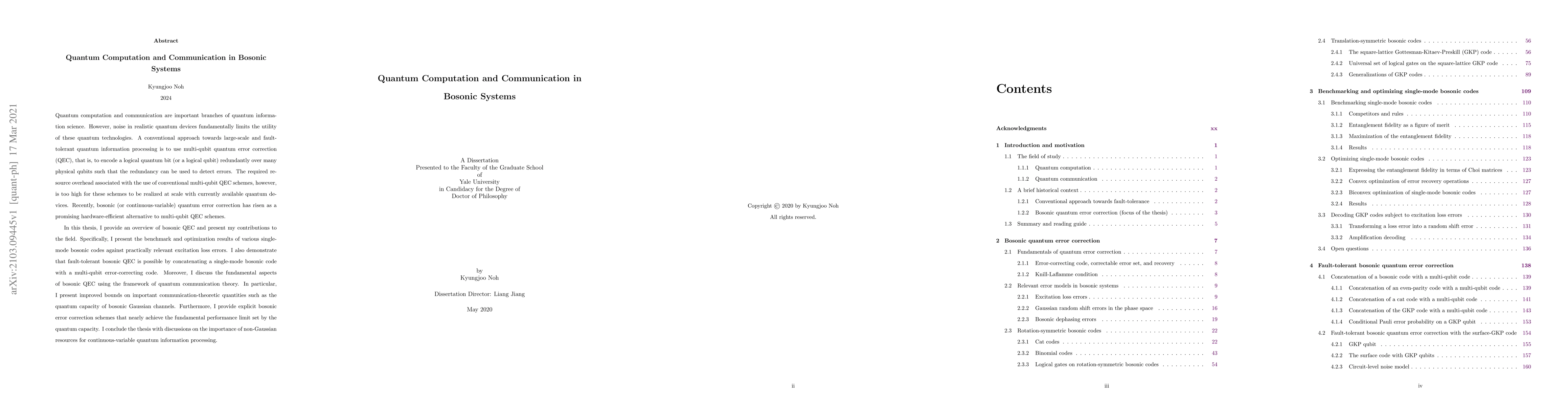 This thesis explores bosonic quantum error correction as a promising alternative to multi-qubit methods, demonstrating improved bounds on communication-theoretic quantities and nearly achieving the fundamental performance limit for continuous-variable quantum information processing.