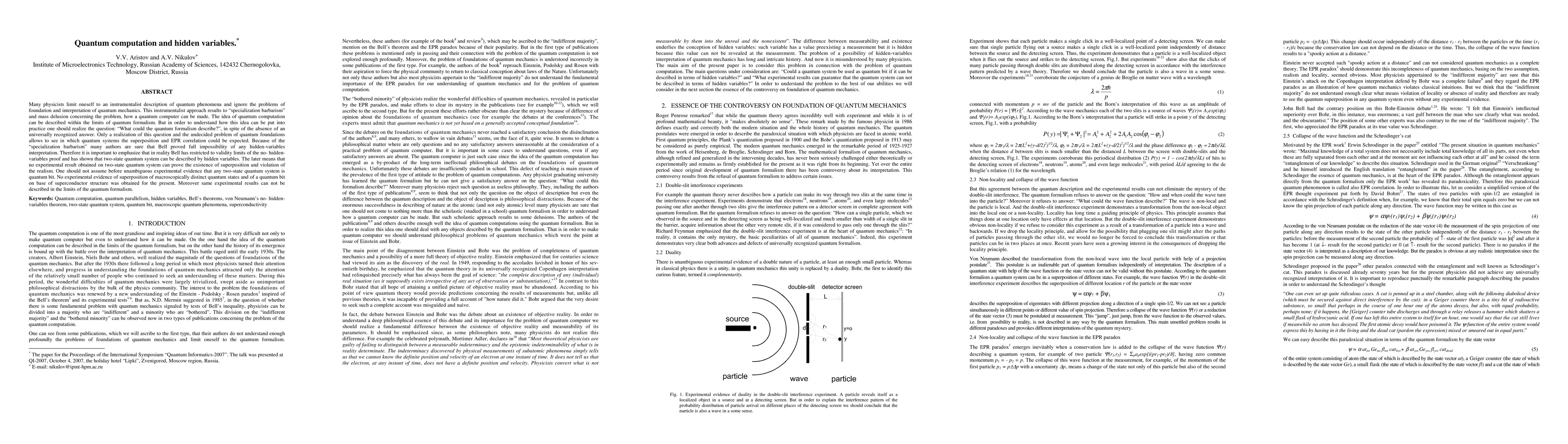 This paper argues that quantum computation's practical realization hinges on resolving the foundational issues of quantum mechanics, particularly the role of hidden variables. It challenges the belief that Bell's theorem precludes any hidden-variables interpretation, emphasizing that Bell's proof only applies to certain quantum systems, leaving room for hidden-variable descriptions in two-state systems.
