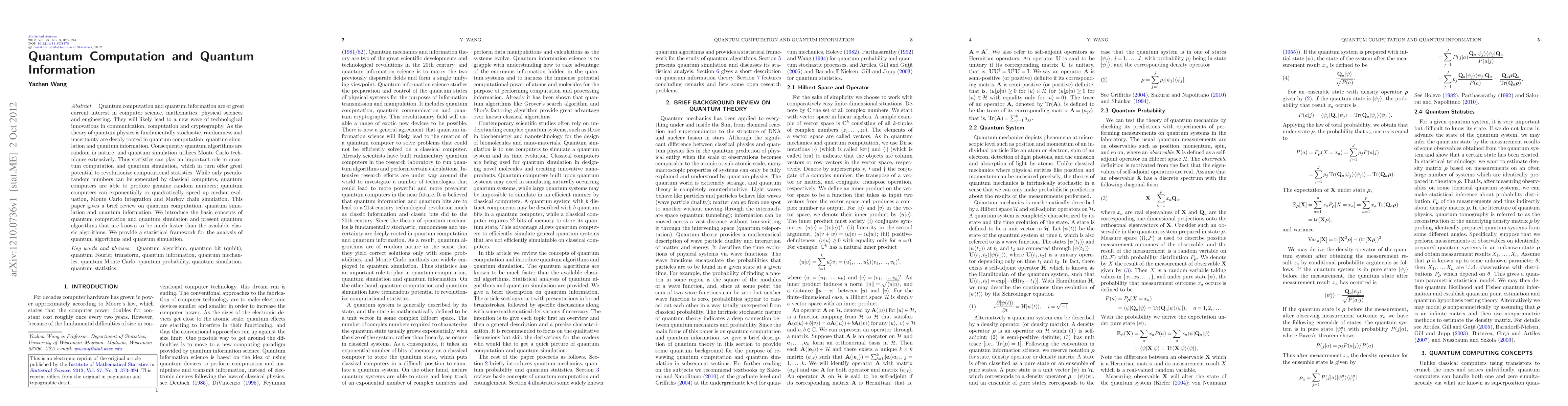 Quantum computation and quantum information are of great current interest in computer science, mathematics, physical sciences and engineering. They will likely lead to a new wave of technological innovations in communication, computation and cryptography. As the theory of quantum physics is fundamentally stochastic, randomness and uncertainty are deeply rooted in quantum computation, quantum simulation and quantum information. Consequently quantum algorithms are random in nature, and quantum simulation utilizes Monte Carlo techniques extensively. Thus statistics can play an important role in quantum computation and quantum simulation, which in turn offer great potential to revolutionize computational statistics. While only pseudo-random numbers can be generated by classical computers, quantum computers are able to produce genuine random numbers; quantum computers can exponentially or quadratically speed up median evaluation, Monte Carlo integration and Markov chain simulation. This paper gives a brief review on quantum computation, quantum simulation and quantum information. We introduce the basic concepts of quantum computation and quantum simulation and present quantum algorithms that are known to be much faster than the available classic algorithms. We provide a statistical framework for the analysis of quantum algorithms and quantum simulation.