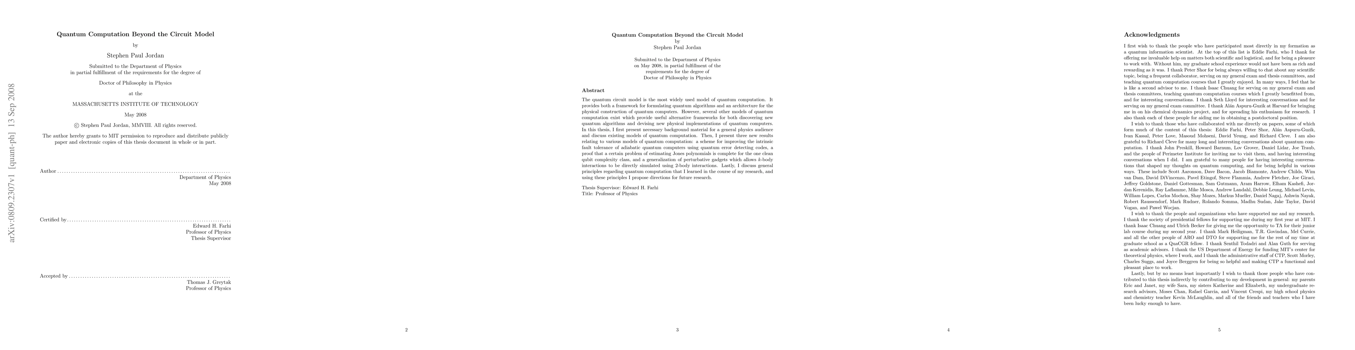 This paper explores quantum computation beyond the traditional circuit model, presenting background on various quantum computation frameworks and three significant results: enhancing fault tolerance in adiabatic quantum computers, proving complexity for estimating Jones polynomials, and generalizing perturbative gadgets for simulating k-body interactions. It concludes with proposed directions for future research.