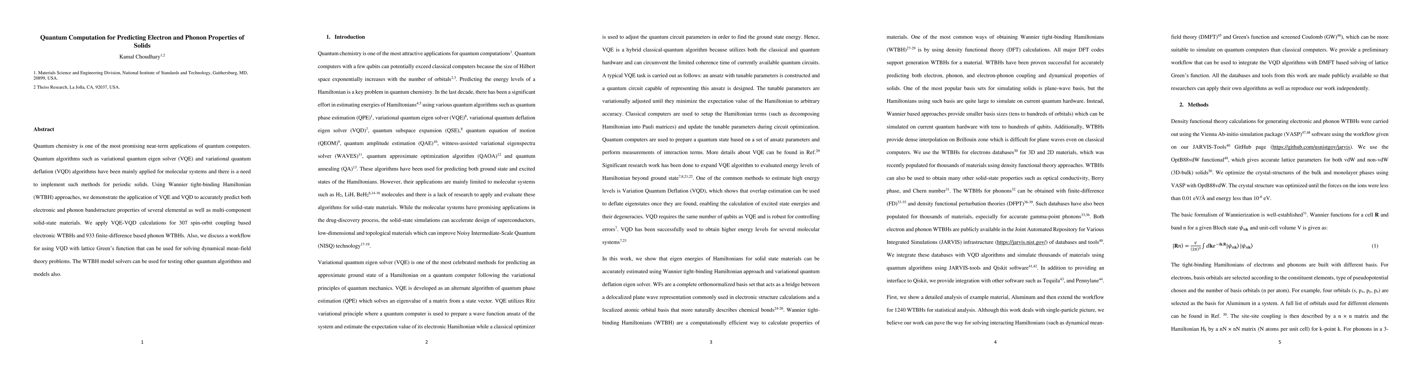 Quantum chemistry is one of the most promising near-term applications of quantum computers. Quantum algorithms such as variational quantum eigen solver (VQE) and variational quantum deflation (VQD) algorithms have been mainly applied for molecular systems and there is a need to implement such methods for periodic solids. Using Wannier tight-binding Hamiltonian (WTBH) approaches, we demonstrate the application of VQE and VQD to accurately predict both electronic and phonon bandstructure properties of several elemental as well as multi-component solid-state materials. We apply VQE-VQD calculations for 307 spin-orbit coupling based electronic WTBHs and 933 finite-difference based phonon WTBHs. Also, we discuss a workflow for using VQD with lattice Greens function that can be used for solving dynamical mean-field theory problems. The WTBH model solvers can be used for testing other quantum algorithms and models also.