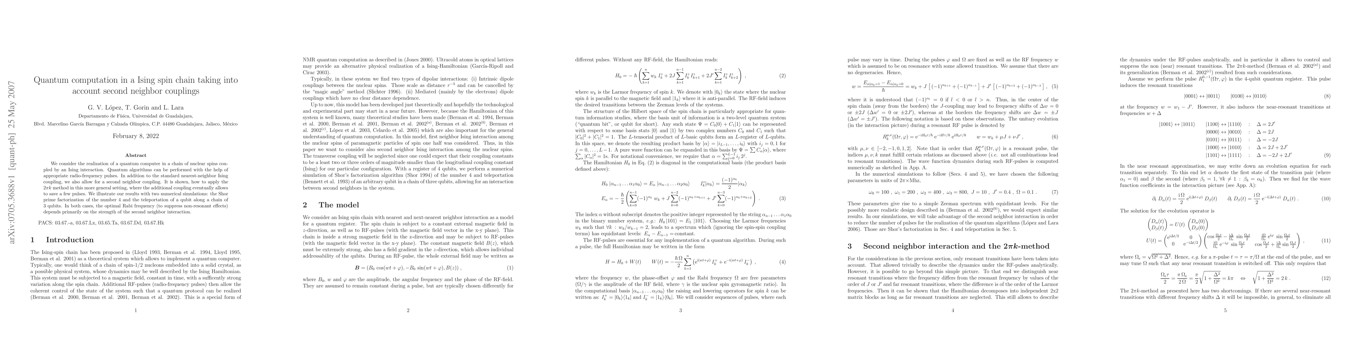 This paper explores quantum computation using a chain of nuclear spins with both nearest-neighbor and second-neighbor Ising couplings, employing radio-frequency pulses to perform quantum algorithms. The inclusion of second-neighbor couplings allows for optimization in pulse usage, demonstrated through simulations of Shor's algorithm and qubit teleportation.