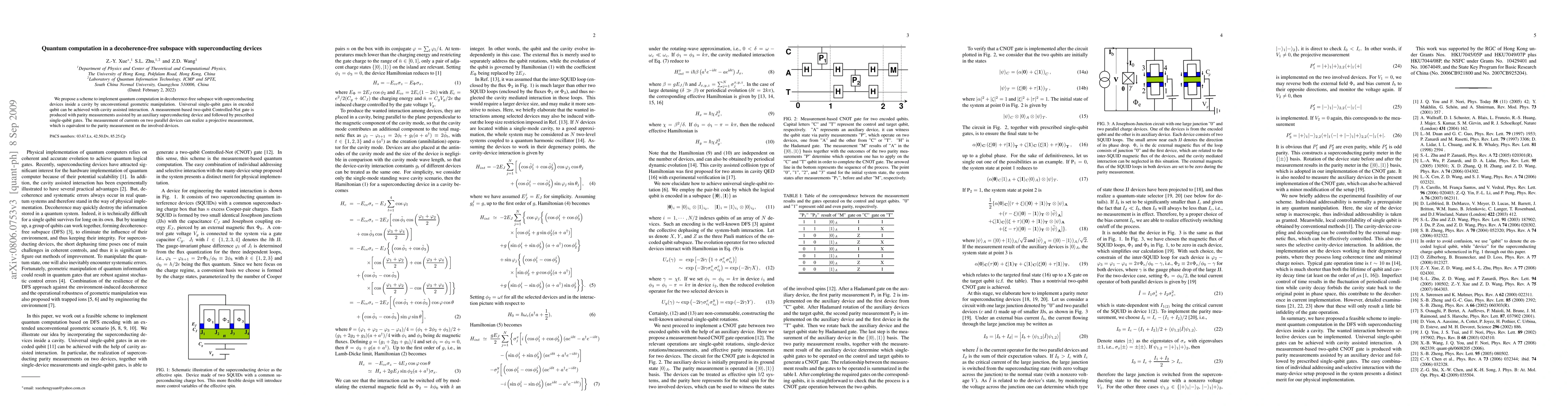 This paper proposes a quantum computation scheme using superconducting devices within a cavity to operate in a decoherence-free subspace. It utilizes geometric manipulation to achieve universal single-qubit gates and a measurement-based two-qubit Controlled-Not gate, employing cavity-assisted interactions and auxiliary devices for projective measurements.