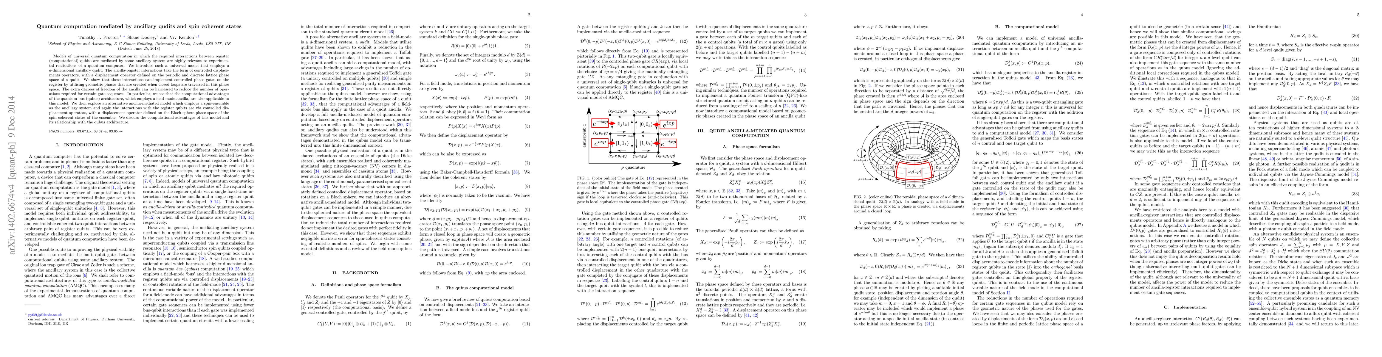 Models of universal quantum computation in which the required interactions between register (computational) qubits are mediated by some ancillary system are highly relevant to experimental realisations of a quantum computer. We introduce such a universal model that employs a $d$-dimensional ancillary qudit. The ancilla-register interactions take the form of controlled displacements operators, with a displacement operator defined on the periodic and discrete lattice phase space of a qudit. We show that these interactions can implement controlled phase gates on the register by utilising geometric phases that are created when closed loops are traversed in this phase space. The extra degrees of freedom of the ancilla can be harnessed to reduce the number of operations required for certain gate sequences. In particular, we see that the computational advantages of the quantum bus (qubus) architecture, which employs a field-mode ancilla, are also applicable to this model. We then explore an alternative ancilla-mediated model which employs a spin-ensemble as the ancillary system and again the interactions with the register qubits are via controlled displacement operators, with a displacement operator defined on the Bloch sphere phase space of the spin coherent states of the ensemble. We discuss the computational advantages of this model and its relationship with the qubus architecture.