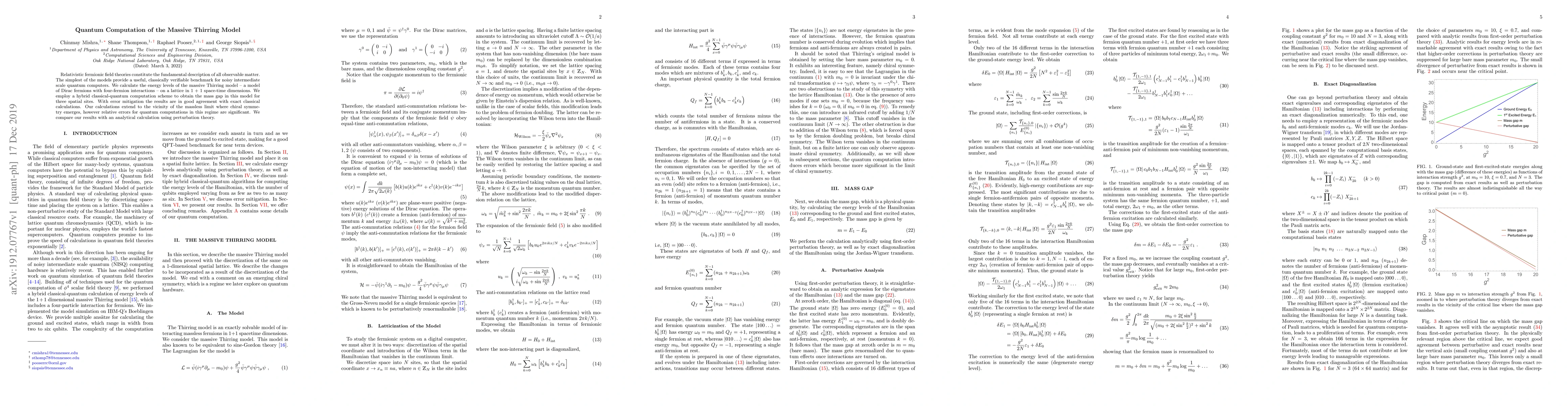 Researchers calculated energy levels of the massive Thirring model on a lattice in 1+1 space-time dimensions using a hybrid classical-quantum computation scheme, achieving good agreement with exact classical calculations and analytical results.