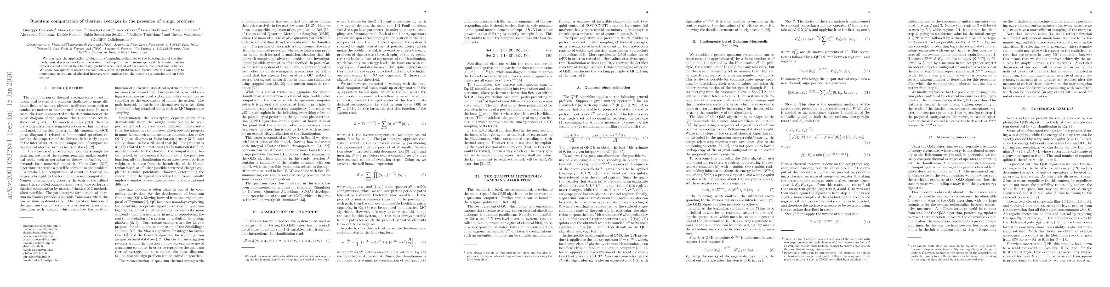 We illustrate the application of Quantum Computing techniques to the investigation of the thermodynamical properties of a simple system, made up of three quantum spins with frustrated pair interactions and affected by a hard sign problem when treated within classical computational schemes. We show how quantum algorithms completely solve the problem, and discuss how this can apply to more complex systems of physical interest, with emphasis on the possible systematics and on their control.