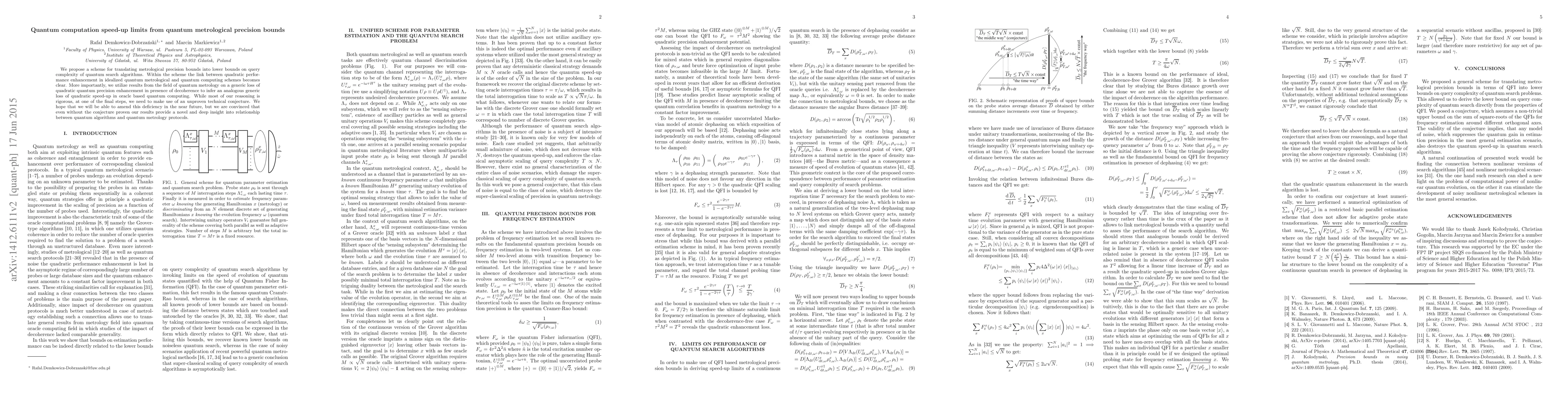 This paper proposes a method to translate metrological precision bounds into lower bounds on quantum search algorithms' query complexity, revealing a connection between quantum metrological and computing enhancements. It also infers a loss of quadratic speed-up in quantum computing due to decoherence, though it relies on an unproven conjecture for final conclusions.