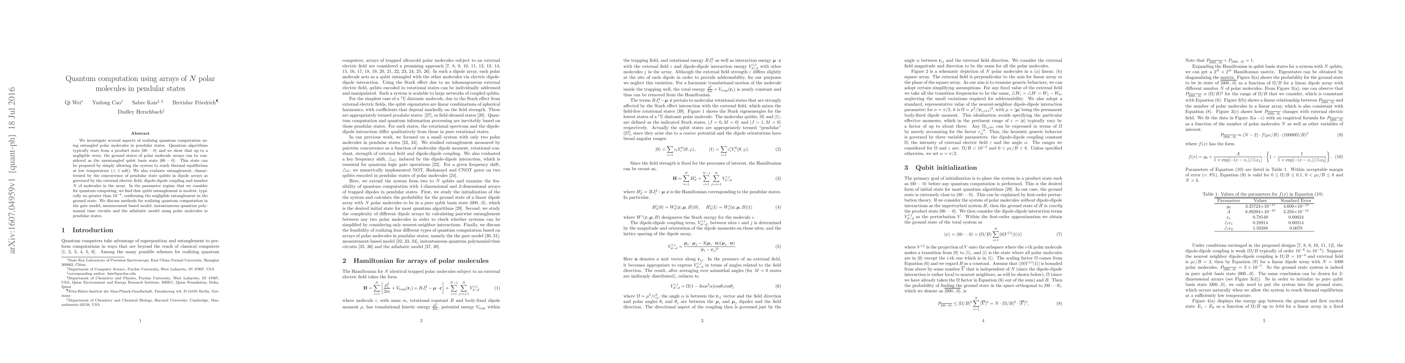 This paper explores quantum computation using arrays of N polar molecules in pendular states, demonstrating that their ground states can be treated as unentangled qubit basis states. It evaluates the entanglement in these states, finding it to be negligible, and discusses various quantum computation models applicable to this system.