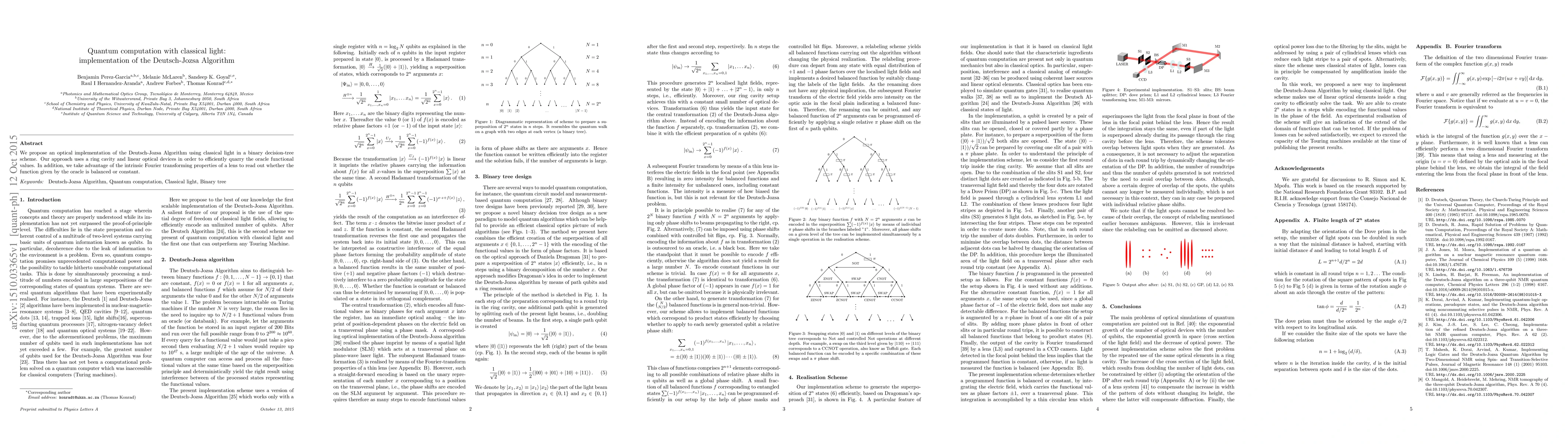 The paper introduces a linear optical implementation of the Deutsch-Jozsa algorithm using classical light, efficiently creating a superposition of 2^n states in n steps and encoding functional values as phase factors in the electric field.