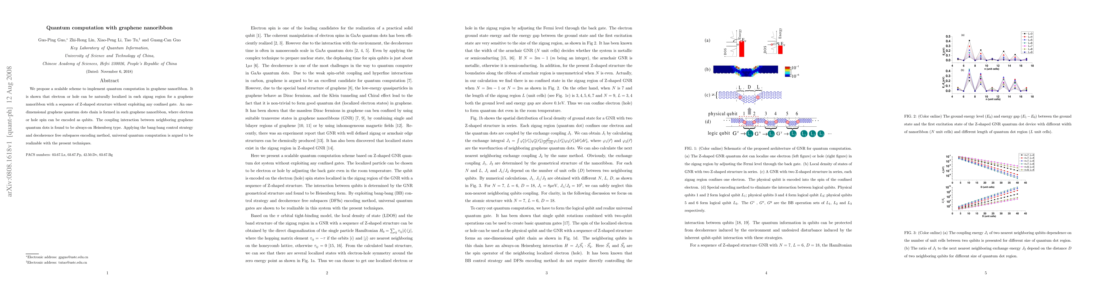 This paper proposes a scalable quantum computing scheme using graphene nanoribbons, where electron or hole spins in a one-dimensional chain of quantum dots can serve as qubits. The interaction between these qubits is always-on Heisenberg type, and universal quantum computation is achievable through bang-bang control and decoherence-free subspace encoding.
