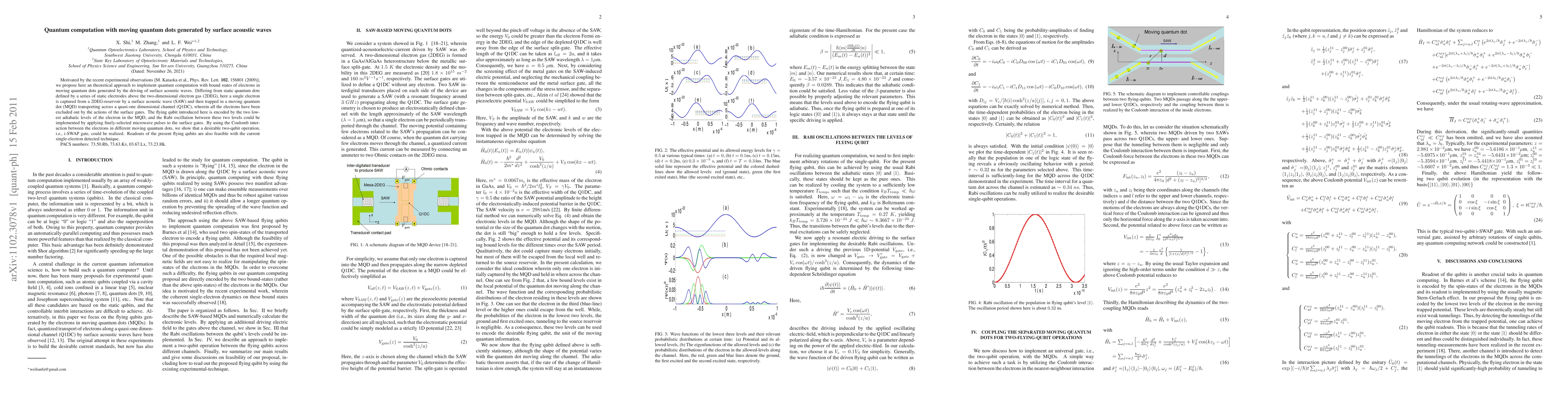 This paper proposes a theoretical framework for quantum computation using moving quantum dots generated by surface acoustic waves, where electrons are captured and manipulated in a quasi-one-dimensional channel. The flying qubit is encoded in the two lowest adiabatic levels of the electron, allowing for Rabi oscillation and two-qubit operations via Coulomb interactions.