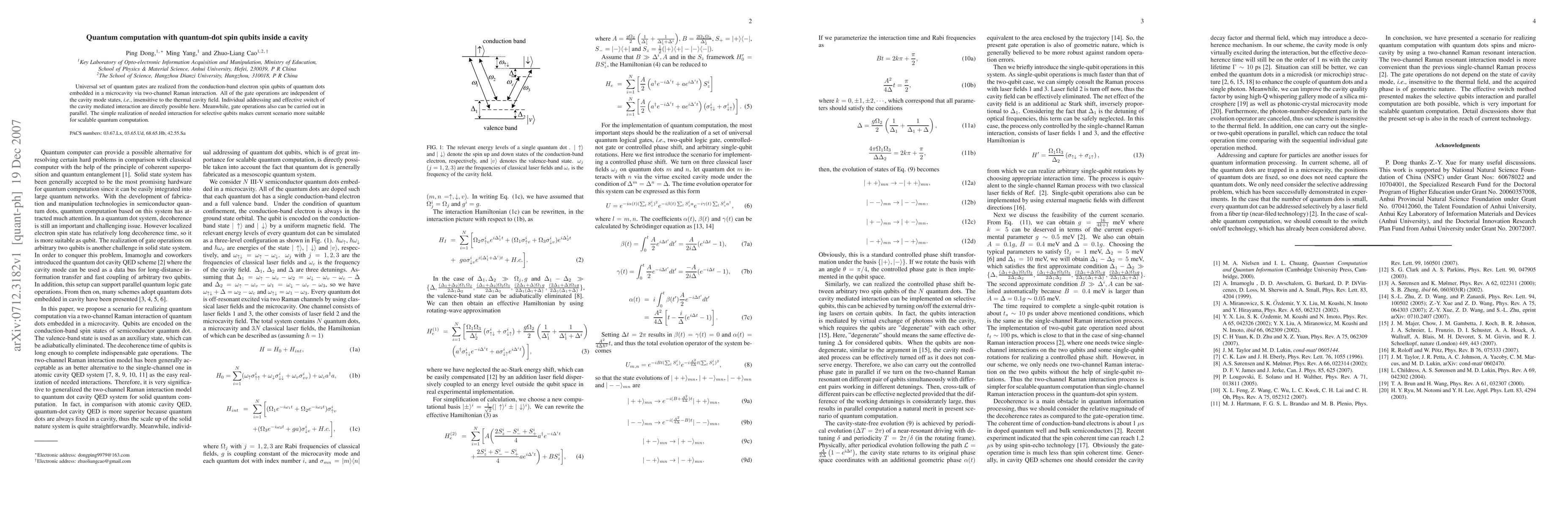 This paper presents a method for universal quantum gate operations using quantum-dot spin qubits within a microcavity, employing two-channel Raman interaction. The approach allows for individual addressing, parallel gate operations, and scalability for quantum computation, while remaining insensitive to thermal cavity field fluctuations.