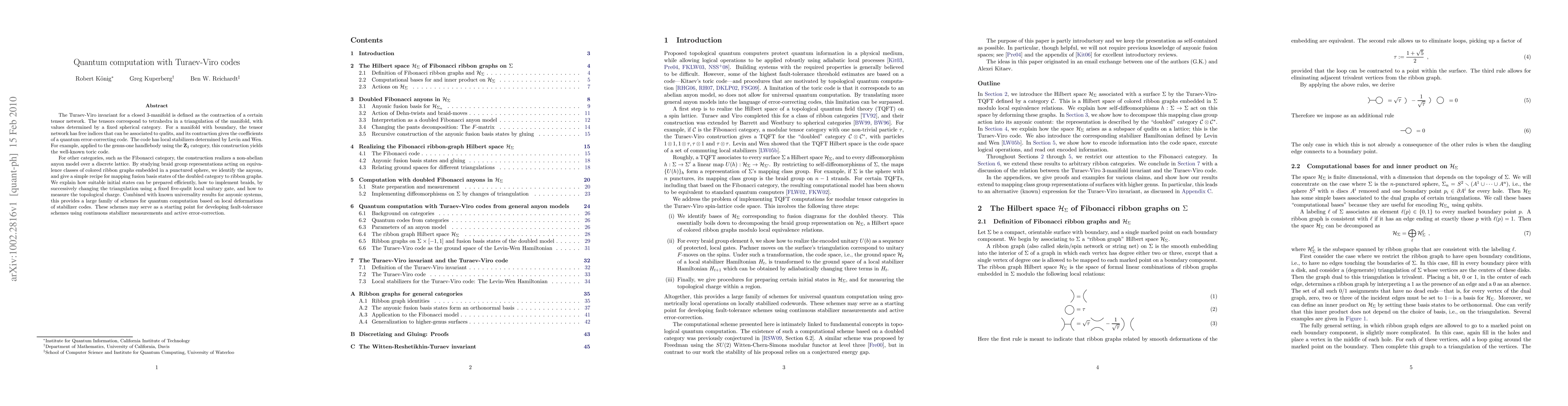 This paper explores quantum computation using Turaev-Viro codes, which are derived from tensor networks representing closed 3-manifolds. The codes, with local stabilizers from Levin and Wen, can be adapted for quantum error correction and anyon models, offering a framework for fault-tolerant quantum computation based on continuous stabilizer measurements and active error-correction.