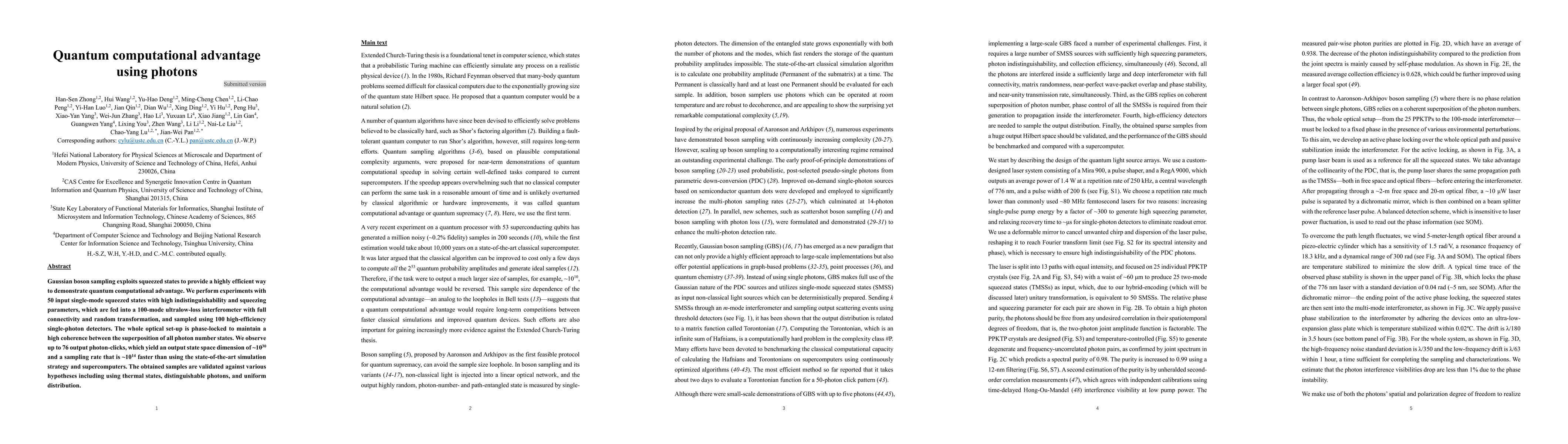 This paper demonstrates quantum computational advantage through Gaussian boson sampling with squeezed photon states, achieving a sampling rate $10^{14}$ times faster than classical supercomputers. Experiments utilize a 100-mode interferometer with high-efficiency detectors, showing a significant output state space dimension.