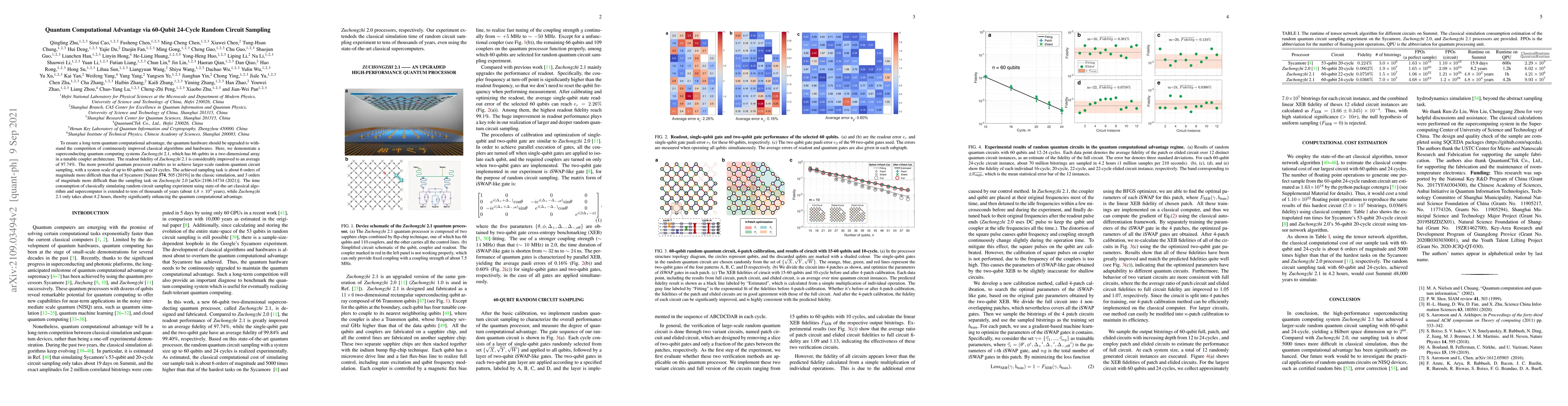 This paper demonstrates the quantum computational advantage of the \textit{Zuchongzhi} 2.1 superconducting quantum computing system, achieving a 60-qubit 24-cycle random circuit sampling task that is 6 orders of magnitude more challenging than Sycamore's equivalent task. The system's efficiency allows it to complete the task in 4.2 hours, compared to tens of thousands of years for classical simulation.