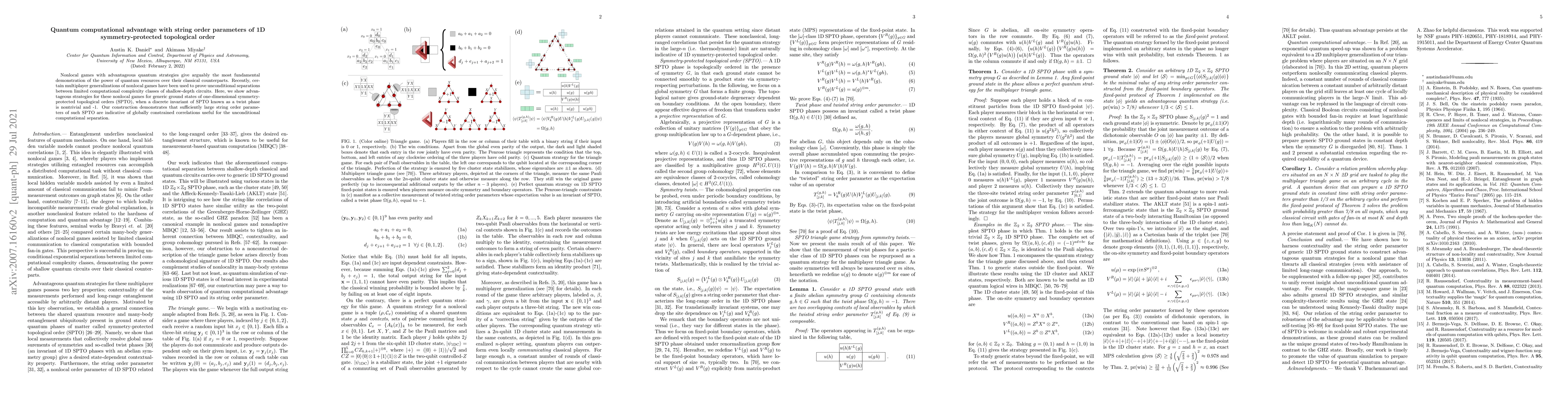 Nonlocal games with advantageous quantum strategies give arguably the most fundamental demonstration of the power of quantum resources over their classical counterparts. Recently, certain multiplayer generalizations of nonlocal games have been used to prove unconditional separations between small computational complexity classes of shallow-depth circuits. Here, we show advantageous strategies for these nonlocal games for generic ground states of one-dimensional symmetry-protected topological orders (SPTOs), when a discrete invariant of a SPTO known as a twist phase is nontrivial and -1. Our construction demonstrates that sufficiently large string order parameters of such SPTOs are indicative of globally constrained correlations useful for the unconditional computational separation.