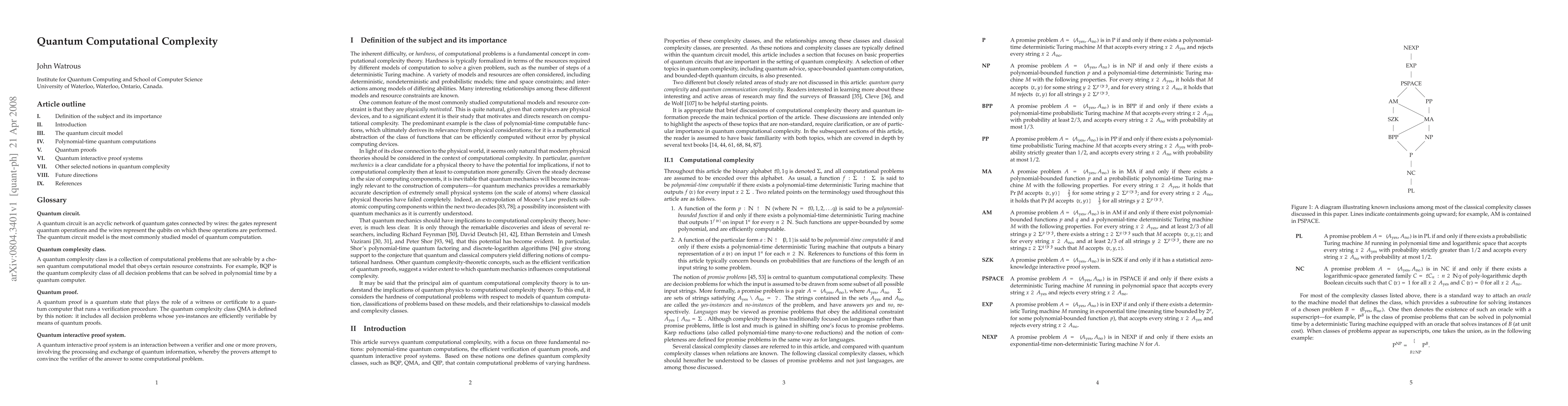 This paper surveys quantum computational complexity, emphasizing polynomial-time quantum computations, efficient verification of quantum proofs, and quantum interactive proof systems. It explores quantum complexity classes like BQP, QMA, and QIP, and touches on quantum advice, space-bounded computation, and bounded-depth quantum circuits.