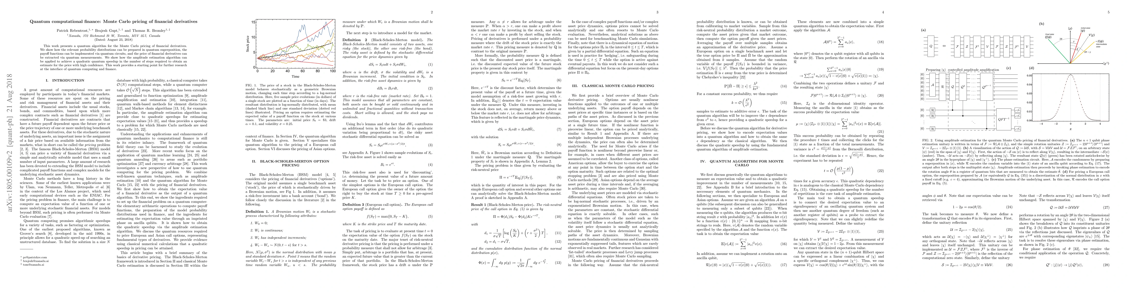 This paper introduces a quantum algorithm for Monte Carlo pricing of financial derivatives, leveraging quantum superposition and amplitude estimation to achieve a quadratic speedup over classical methods. The approach prepares probability distributions and implements payoff functions using quantum circuits, marking a foundational step in quantum computational finance.