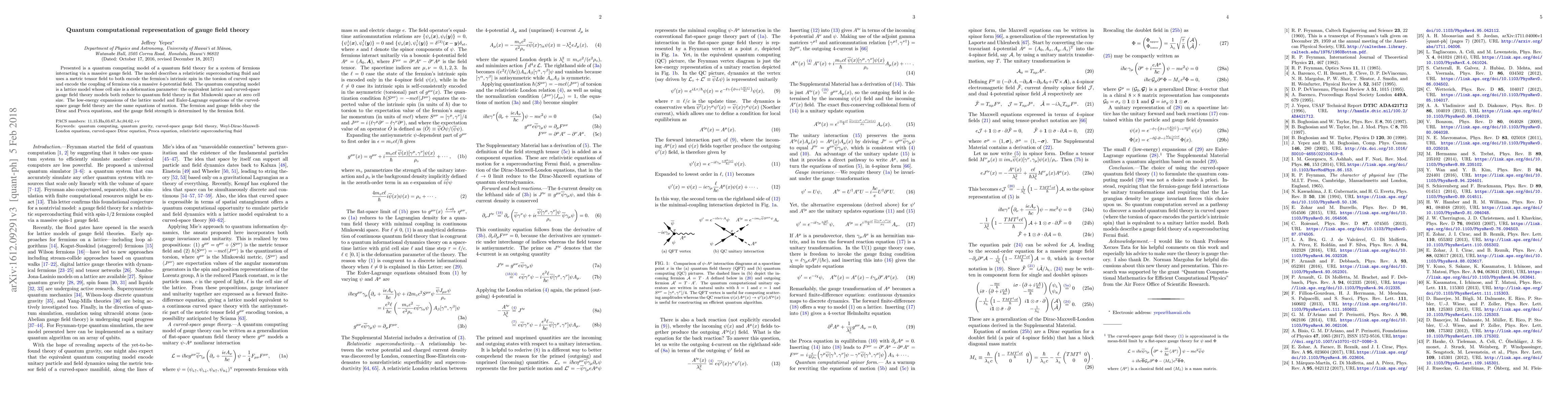 Presented is a quantum computing model of a quantum field theory for a system of fermions interacting via a massive gauge field. The model describes a relativistic superconducting fluid and uses a metric tensor field to both encode the fermion's intrinsic spin in the torsion of curved space and encode the coupling of fermions via a massive 4-potential field. The quantum computing model is a lattice model whose cell size is a deformation parameter: the equivalent lattice and curved-space gauge field theory models both reduce to quantum field theory in flat Minkowski space at zero cell size. The low-energy expansions of the lattice model and Euler-Lagrange equations of the curved-space gauge field theory are the same equations of motion. The fermion and gauge fields obey the Dirac and Proca equations, and the gauge field strength is determined by the fermion field.