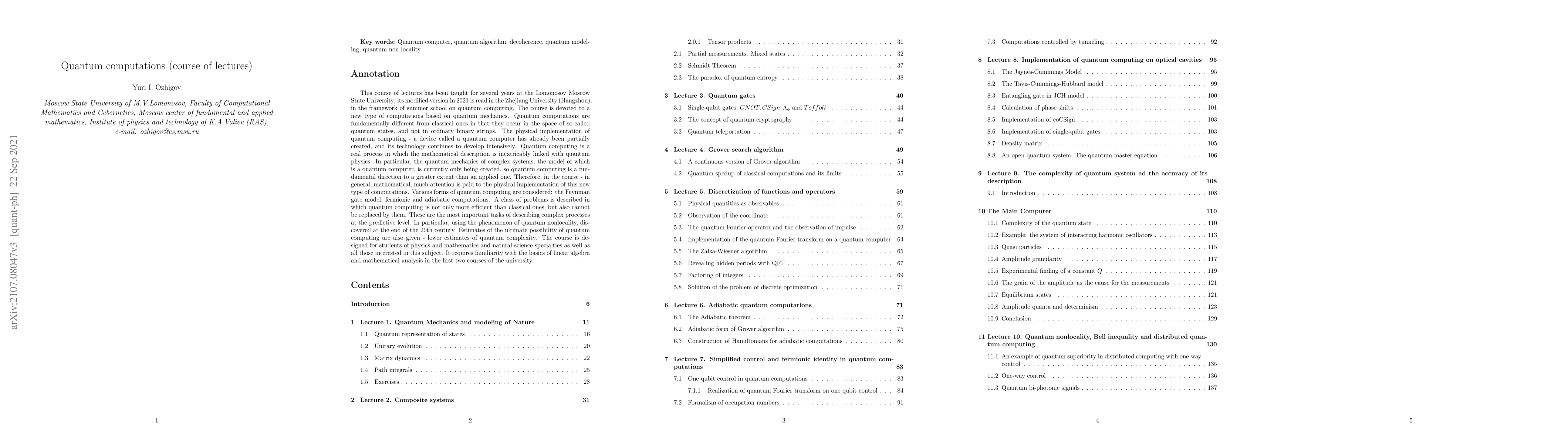 This course of lectures has been taught for several years at the Lomonosov Moscow State University; its modified version in 2021 is read in the Zhejiang University (Hangzhou), in the framework of summer school on quantum computing. The course is devoted to a new type of computations based on quantum mechanics. Quantum computations are fundamentally different from classical ones in that they occur in the space of so-called quantum states, and not in ordinary binary strings. Quantum computing is a real process in which the mathematical description is inextricably linked with quantum physics. Various forms of quantum computing are considered: the Feynman gate model, fermionic and adiabatic computations. A class of problems is described in which quantum computing is not only more efficient than classical ones, but also cannot be replaced by them. The course is designed for students of physics and mathematics and natural science specialties as well as all those interested in this subject. It requires familiarity with the basics of linear algebra and mathematical analysis in the first two courses of the university.