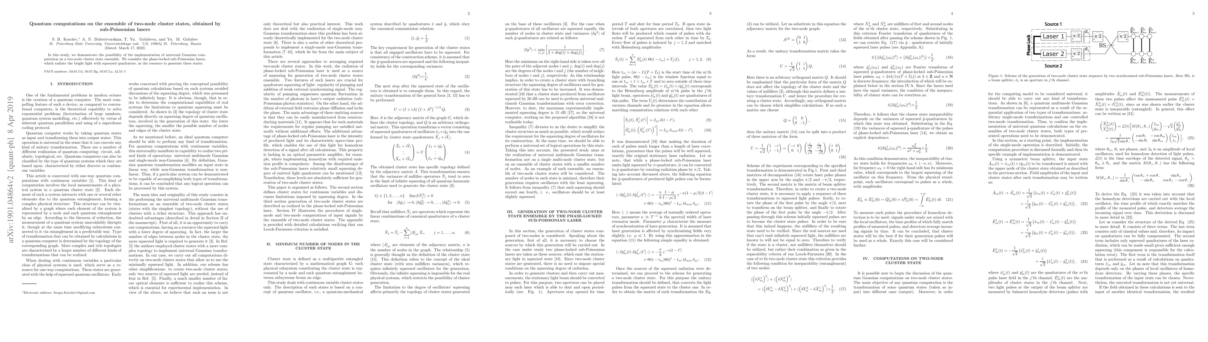 In this study, we demonstrate the possibility of the implementation of universal Gaussian computation on a two-node cluster state ensemble. We consider the phase-locked sub-Poissonian lasers, which radiate the bright light with squeezed quadrature, as the resource to generate these states.