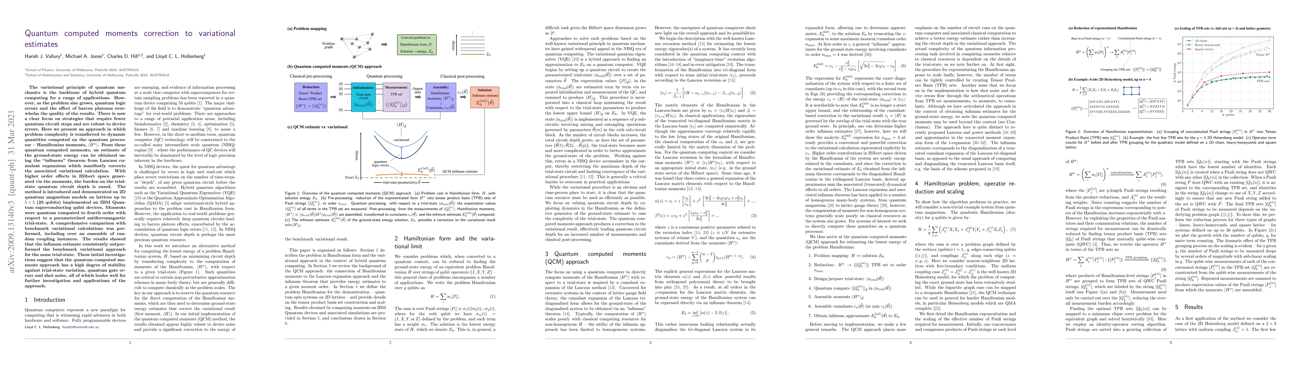 The variational principle of quantum mechanics is the backbone of hybrid quantum computing for a range of applications. However, as the problem size grows, quantum logic errors and the effect of barren plateaus overwhelm the quality of the results. There is now a clear focus on strategies that require fewer quantum circuit steps and are robust to device errors. Here we present an approach in which problem complexity is transferred to dynamic quantities computed on the quantum processor - Hamiltonian moments, $\langle H^n\rangle$. From these quantum computed moments, estimates of the ground-state energy are obtained using the "infinum" theorem from Lanczos cumulant expansions which manifestly correct the associated variational calculation. With system dynamics encoded in the moments the burden on the trial-state quantum circuit depth is eased. The method is introduced and demonstrated on 2D quantum magnetism models on lattices up to 5 $\times$ 5 (25 qubits) implemented on IBM Quantum superconducting qubit devices. Moments were quantum computed to fourth order with respect to a parameterised antiferromagnetic trial-state. A comprehensive comparison with benchmark variational calculations was performed, including over an ensemble of random coupling instances. The results showed that the infinum estimate consistently outperformed the benchmark variational approach for the same trial-state. These initial investigations suggest that the quantum computed moments approach has a high degree of stability against trial-state variation, quantum gate errors and shot noise, all of which bodes well for further investigation and applications of the approach.