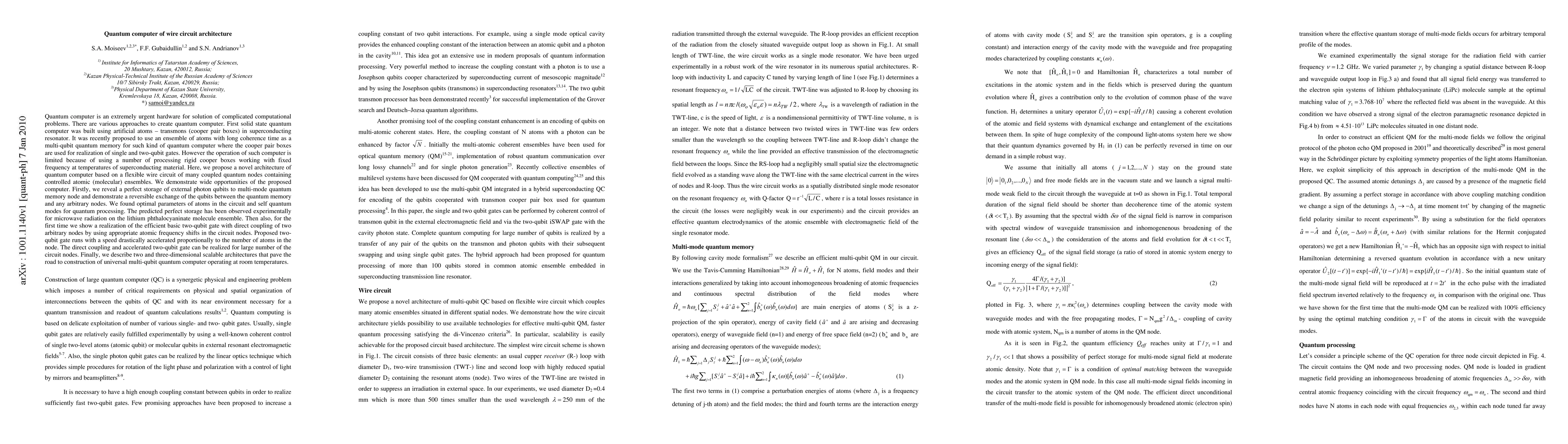 First solid state quantum computer was built using transmons (cooper pair boxes). The operation of the computer is limited because of using a number of the rigit cooper boxes working with fixed frequency at temperatures of superconducting material. Here, we propose a novel architecture of quantum computer based on a flexible wire circuit of many coupled quantum nodes containing controlled atomic (molecular) ensembles. We demonstrate wide opportunities of the proposed computer. Firstly, we reveal a perfect storage of external photon qubits to multi-mode quantum memory node and demonstrate a reversible exchange of the qubits between any arbitrary nodes. We found optimal parameters of atoms in the circuit and self quantum modes for quantum processing. The predicted perfect storage has been observed experimentally for microwave radiation on the lithium phthalocyaninate molecule ensemble. Then also, for the first time we show a realization of the efficient basic two-qubit gate with direct coupling of two arbitrary nodes by using appropriate atomic frequency shifts in the circuit nodes. Proposed two-qubit gate runs with a speed drastically accelerated proportionally to the number of atoms in the node. The direct coupling and accelerated two-qubit gate can be realized for large number of the circuit nodes. Finally, we describe two and three-dimensional scalable architectures that pave the road to construction of universal multi-qubit quantum computer operating at room temperatures.