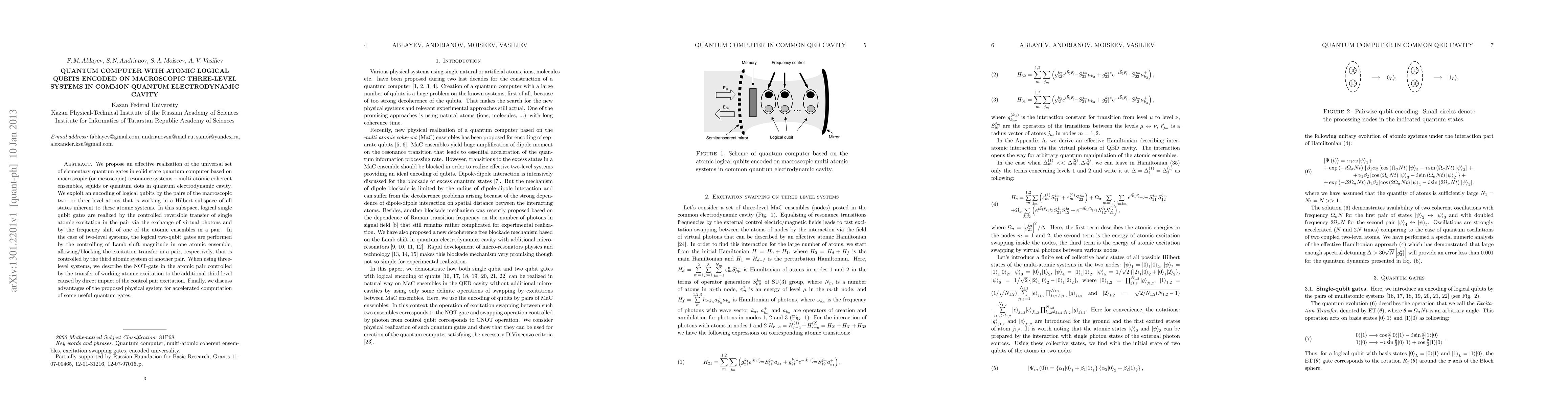 This paper proposes a solid-state quantum computer using macroscopic three-level atomic systems in a quantum electrodynamic cavity to encode logical qubits. It describes the implementation of quantum gates through controlled reversible transfers and frequency shifts, highlighting the potential for accelerated quantum computation.