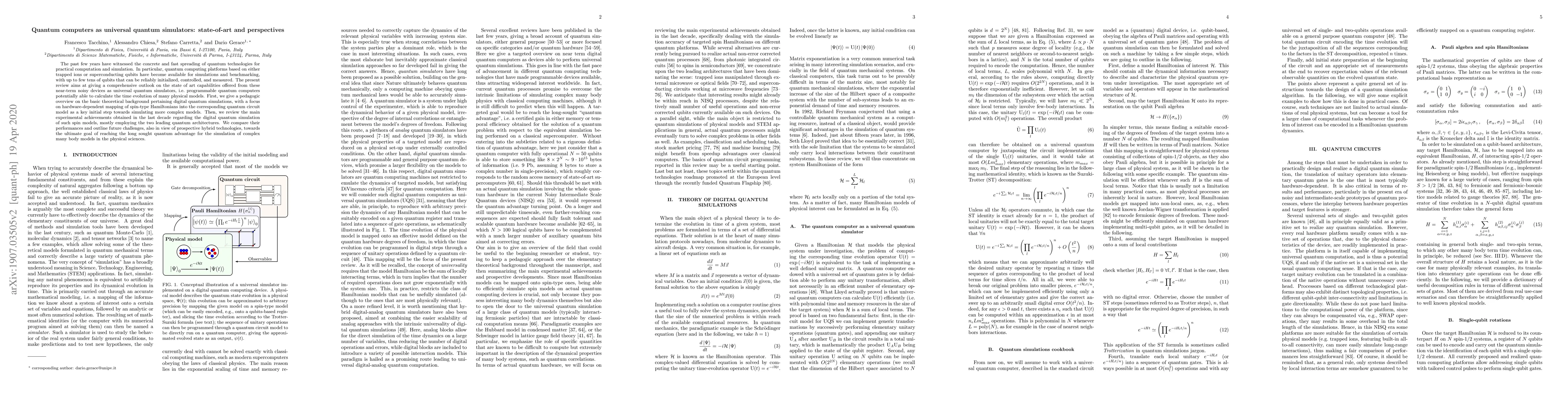 This paper reviews the current state and future prospects of quantum computing platforms, particularly trapped ions and superconducting qubits, as universal quantum simulators. It provides a theoretical overview of digital quantum simulations and discusses recent experimental achievements, comparing their performances and identifying challenges for achieving quantum advantage in simulating complex many-body systems.