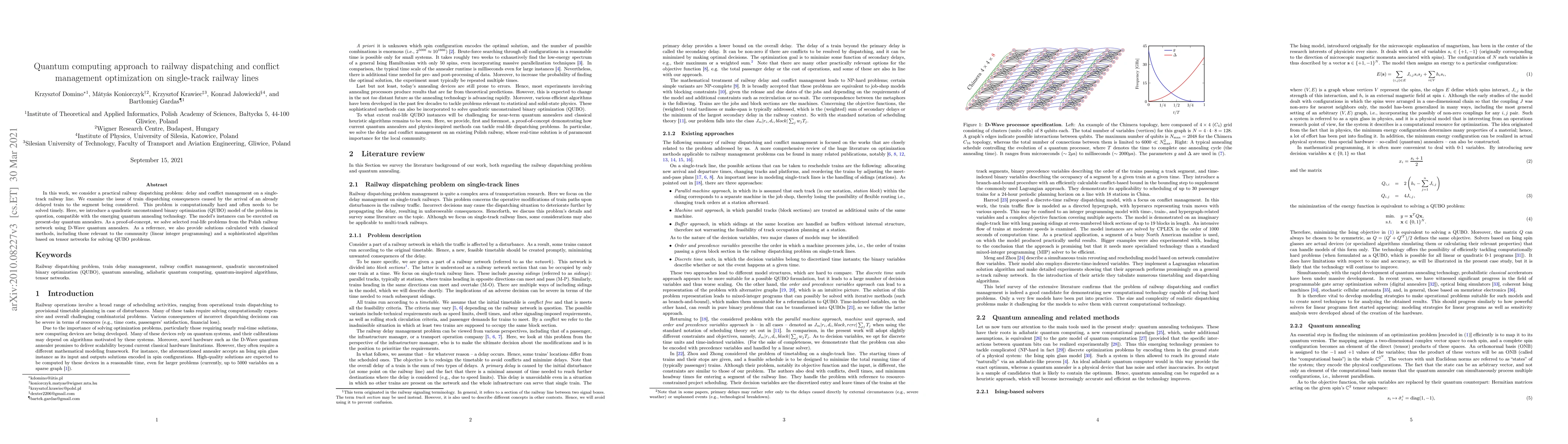In this work, we consider a practical railway dispatching problem: delay and conflict management on a single-track railway line. We examine the issue of train dispatching consequences caused by the arrival of an already delayed train to the segment being considered. This problem is computationally hard and often needs to be solved timely. Here, we introduce a quadratic unconstrained binary optimization (QUBO) model of the problem in question, compatible with the emerging quantum annealing technology. The model's instances can be executed on present-day quantum annealers. As a proof-of-concept, we solve selected real-life problems from the Polish railway network using D-Wave quantum annealers. As a reference, we also provide solutions calculated with classical methods, including those relevant to the community (linear integer programming) and a sophisticated algorithm based on tensor networks for solving QUBO problems.