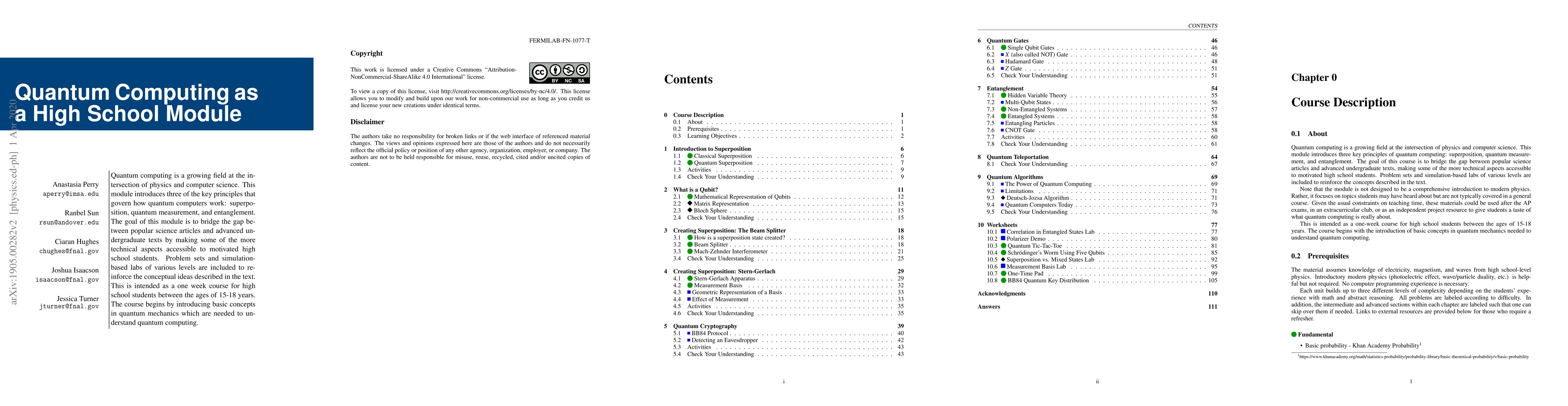This module introduces high school students to quantum computing principles like superposition, quantum measurement, and entanglement, bridging popular science and advanced texts. It includes problem sets and simulation labs to reinforce concepts, aiming for a one-week course for ages 15-18.