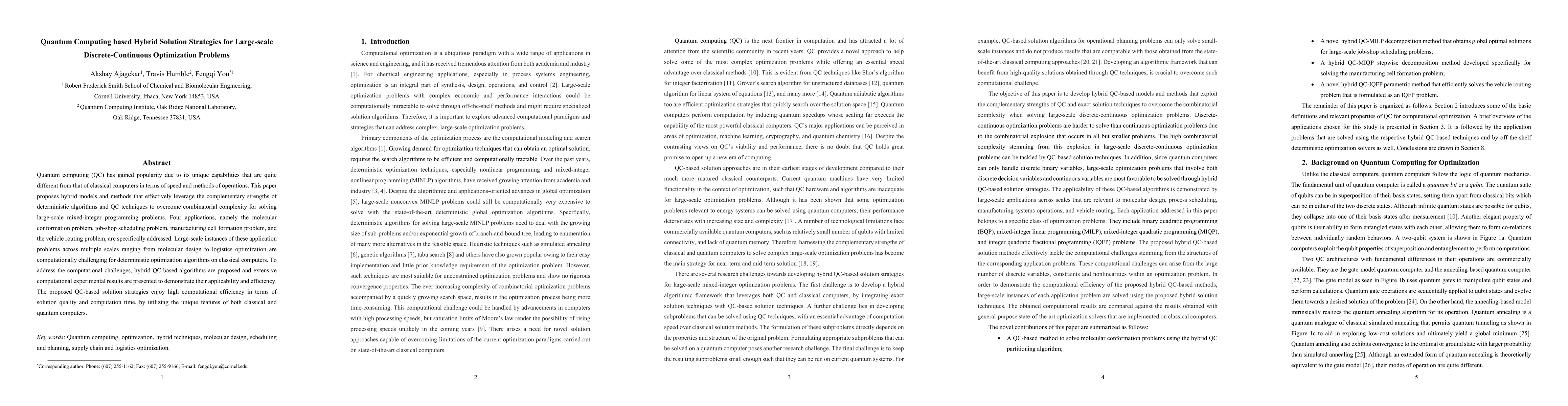 Quantum computing (QC) has gained popularity due to its unique capabilities that are quite different from that of classical computers in terms of speed and methods of operations. This paper proposes hybrid models and methods that effectively leverage the complementary strengths of deterministic algorithms and QC techniques to overcome combinatorial complexity for solving large-scale mixed-integer programming problems. Four applications, namely the molecular conformation problem, job-shop scheduling problem, manufacturing cell formation problem, and the vehicle routing problem, are specifically addressed. Large-scale instances of these application problems across multiple scales ranging from molecular design to logistics optimization are computationally challenging for deterministic optimization algorithms on classical computers. To address the computational challenges, hybrid QC-based algorithms are proposed and extensive computational experimental results are presented to demonstrate their applicability and efficiency. The proposed QC-based solution strategies enjoy high computational efficiency in terms of solution quality and computation time, by utilizing the unique features of both classical and quantum computers.
