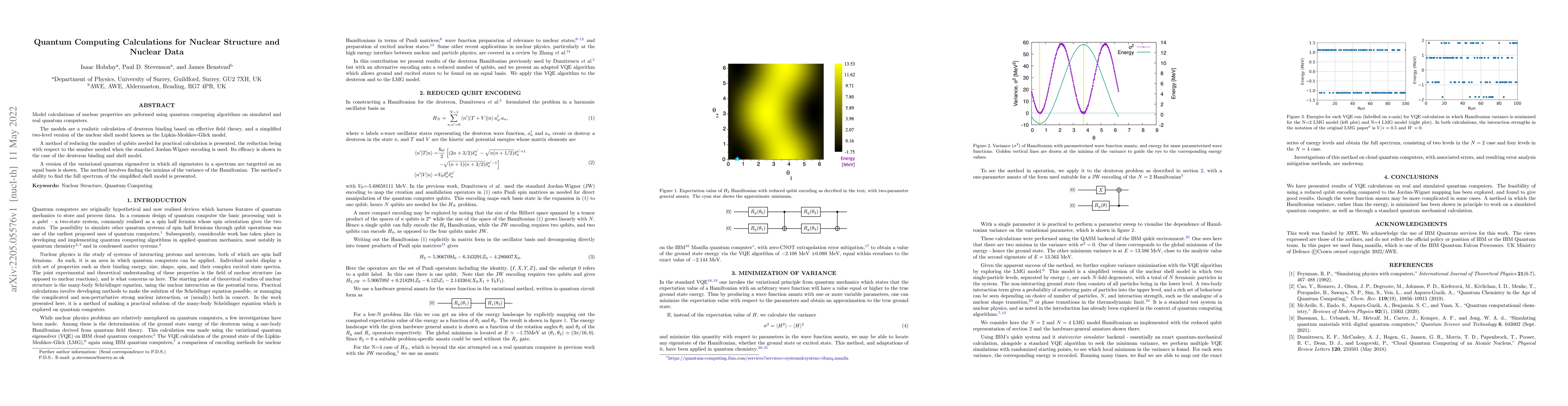 Model calculations of nuclear properties are peformed using quantum computing algorithms on simulated and real quantum computers. The models are a realistic calculation of deuteron binding based on effective field theory, and a simplified two-level version of the nuclear shell model known as the Lipkin-Meshkov-Glick model. A method of reducing the number of qubits needed for practical calculation is presented, the reduction being with respect to the number needed when the standard Jordan-Wigner encoding is used. Its efficacy is shown in the case of the deuteron binding and shell model. A version of the variational quantum eigensolver in which all eigenstates in a spectrum are targetted on an equal basis is shown. The method involves finding the minima of the variance of the Hamiltonian. The method's ability to find the full spectrum of the simplified shell model is presented.