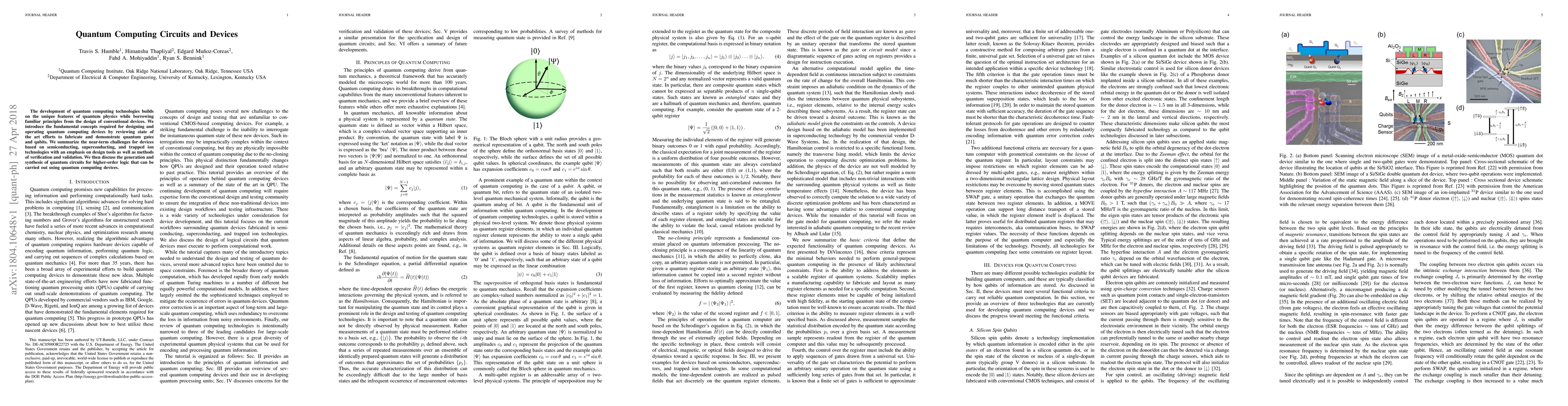 This paper reviews the fundamental concepts and state-of-the-art efforts in designing and operating quantum computing devices, focusing on quantum gates and qubits. It also discusses near-term challenges in semiconducting, superconducting, and trapped ion technologies, along with design tools and verification methods, and explores the generation of quantum circuits for higher-order logic.