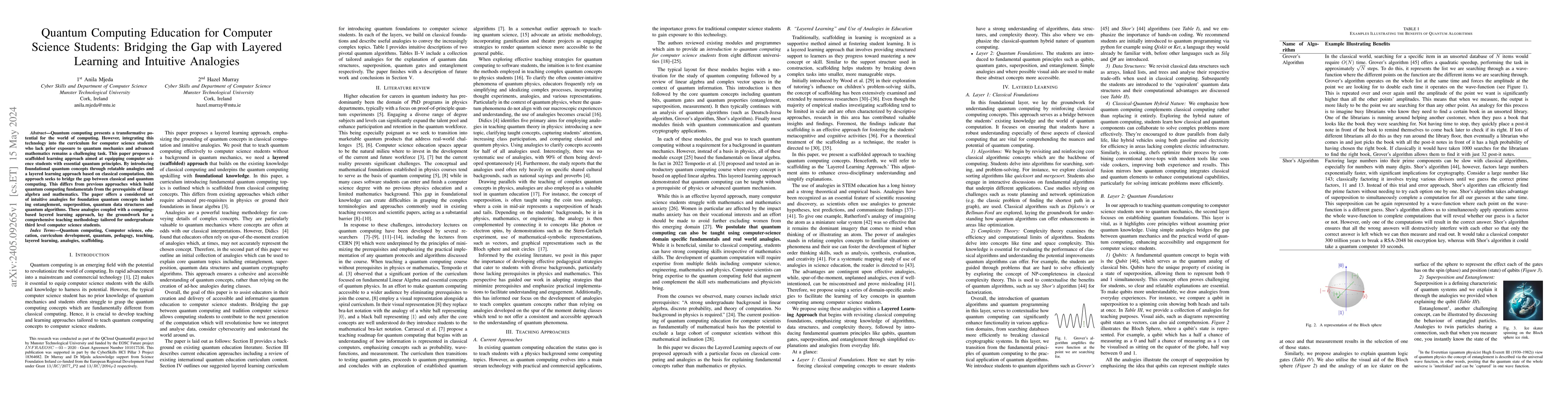 Quantum computing presents a transformative potential for the world of computing. However, integrating this technology into the curriculum for computer science students who lack prior exposure to quantum mechanics and advanced mathematics remains a challenging task. This paper proposes a scaffolded learning approach aimed at equipping computer science students with essential quantum principles. By introducing foundational quantum concepts through relatable analogies and a layered learning approach based on classical computation, this approach seeks to bridge the gap between classical and quantum computing. This differs from previous approaches which build quantum computing fundamentals from the prerequisite of linear algebra and mathematics. The paper offers a considered set of intuitive analogies for foundation quantum concepts including entanglement, superposition, quantum data structures and quantum algorithms. These analogies coupled with a computing-based layered learning approach, lay the groundwork for a comprehensive teaching methodology tailored for undergraduate third level computer science students.