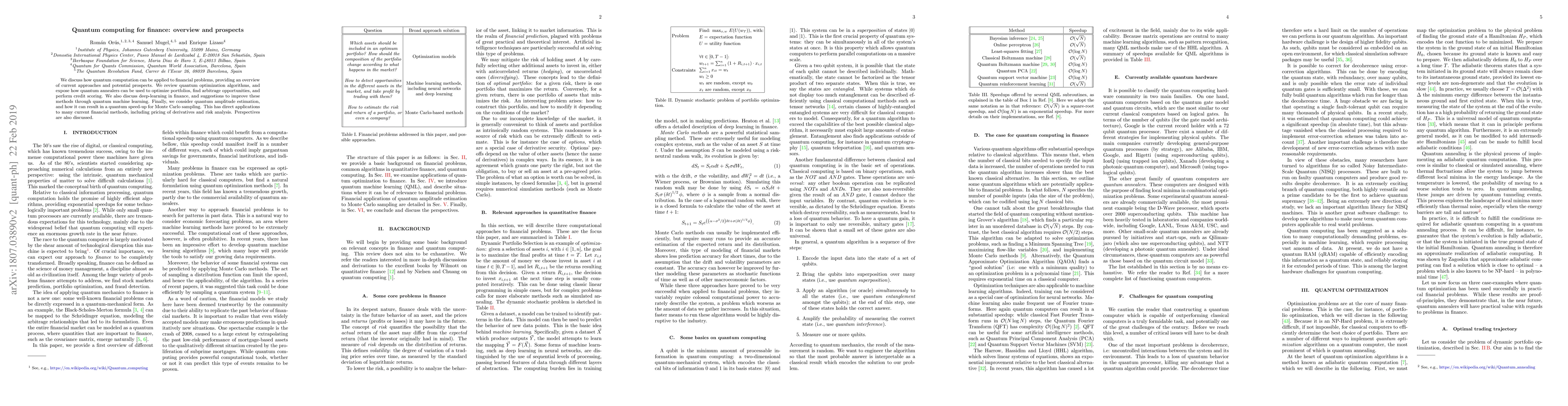 We discuss how quantum computation can be applied to financial problems, providing an overview of current approaches and potential prospects. We review quantum optimization algorithms, and expose how quantum annealers can be used to optimize portfolios, find arbitrage opportunities, and perform credit scoring. We also discuss deep-learning in finance, and suggestions to improve these methods through quantum machine learning. Finally, we consider quantum amplitude estimation, and how it can result in a quantum speed-up for Monte Carlo sampling. This has direct applications to many current financial methods, including pricing of derivatives and risk analysis. Perspectives are also discussed.