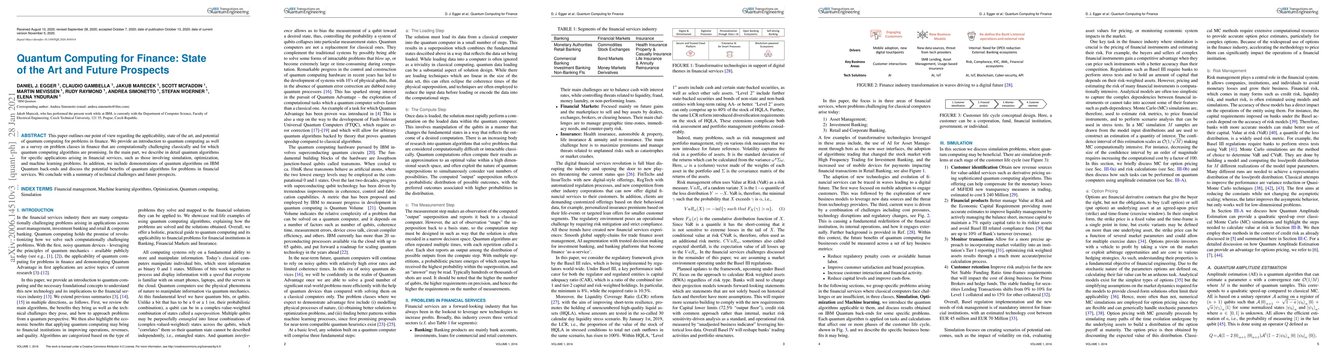 This paper reviews the current state and future potential of quantum computing in finance, detailing quantum algorithms for financial applications like simulation, optimization, and machine learning, and discusses the technical challenges ahead. Demonstrations on IBM Quantum systems highlight the benefits and prospects of quantum computing in financial services.