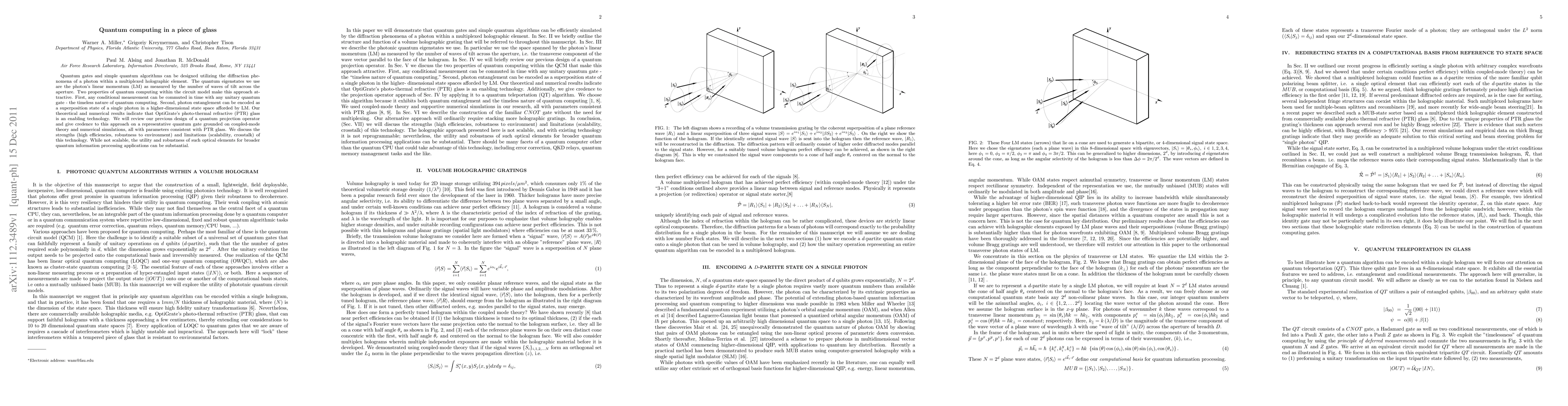 Quantum gates and simple quantum algorithms can be designed utilizing the diffraction phenomena of a photon within a multiplexed holographic element. The quantum eigenstates we use are the photon's linear momentum (LM) as measured by the number of waves of tilt across the aperture. Two properties of quantum computing within the circuit model make this approach attractive. First, any conditional measurement can be commuted in time with any unitary quantum gate - the timeless nature of quantum computing. Second, photon entanglement can be encoded as a superposition state of a single photon in a higher-dimensional state space afforded by LM. Our theoretical and numerical results indicate that OptiGrate's photo-thermal refractive (PTR) glass is an enabling technology. We will review our previous design of a quantum projection operator and give credence to this approach on a representative quantum gate grounded on coupled-mode theory and numerical simulations, all with parameters consistent with PTR glass. We discuss the strengths (high efficiencies, robustness to environment) and limitations (scalability, crosstalk) of this technology. While not scalable, the utility and robustness of such optical elements for broader quantum information processing applications can be substantial.