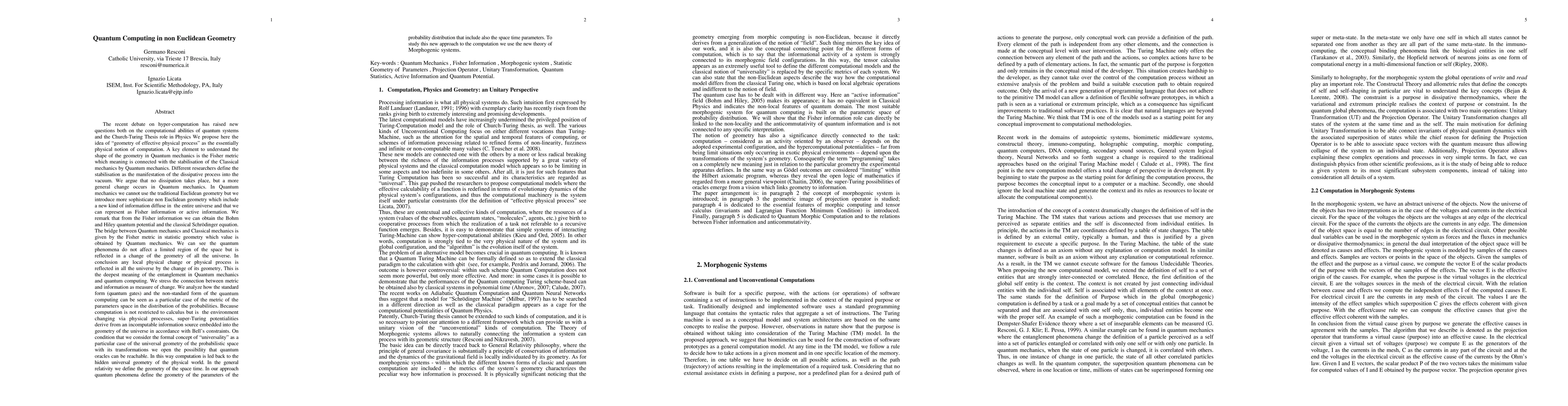 The recent debate on hyper-computation has raised new questions both on the computational abilities of quantum systems and the Church-Turing Thesis role in Physics. We propose here the idea of geometry of effective physical process as the essentially physical notion of computation. In Quantum mechanics we cannot use the traditional Euclidean geometry but we introduce more sophisticate non Euclidean geometry which include a new kind of information diffuse in the entire universe and that we can represent as Fisher information or active information. We remark that from the Fisher information we can obtain the Bohm and Hiley quantum potential and the classical Schrodinger equation. We can see the quantum phenomena do not affect a limited region of the space but is reflected in a change of the geometry of all the universe. In conclusion any local physical change or physical process is reflected in all the universe by the change of its geometry, This is the deepest meaning of the entanglement in Quantum mechanics and quantum computing. We stress the connection between metric and information as measure of change. Because computation is not restricted to calculus but is the environment changing via physical processes, super-Turing potentialities derive from an incomputable information source embedded into the geometry of the universe in accordance with Bell's constraints. In the general relativity we define the geometry of the space time. In our approach quantum phenomena define the geometry of the parameters of the probability distribution that include also the space time parameters. To study this new approach to the computation we use the new theory of Morphogenic systems.