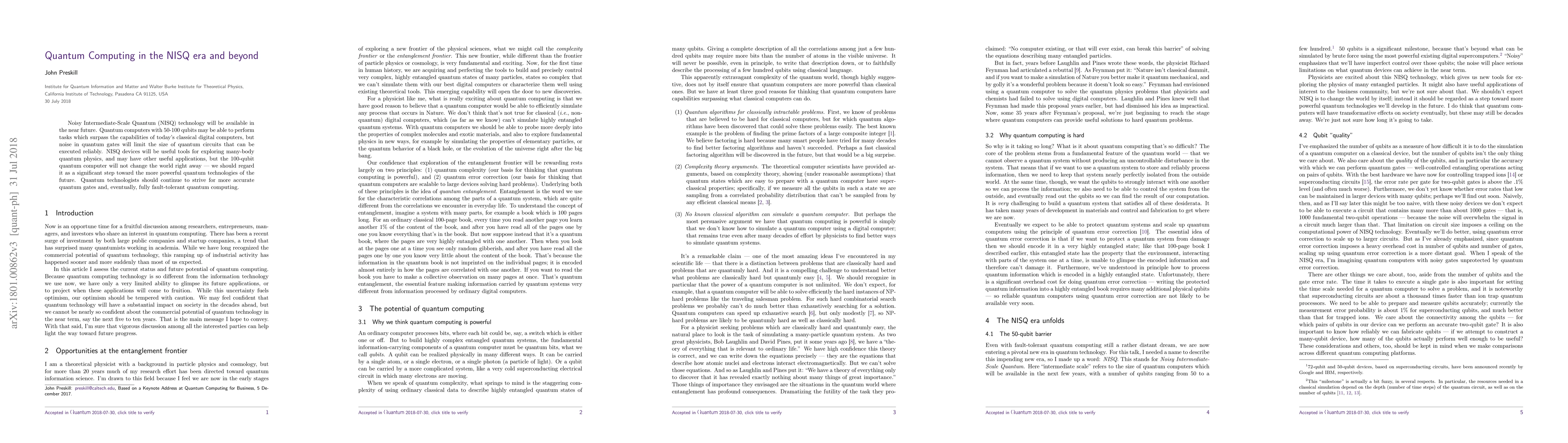Summary: The NISQ era will introduce noisy intermediate-scale quantum computers, capable of outperforming classical systems in certain tasks, though limited by gate noise. These devices will advance quantum physics research but not revolutionize technology immediately; they represent a crucial step toward future, more powerful quantum technologies.