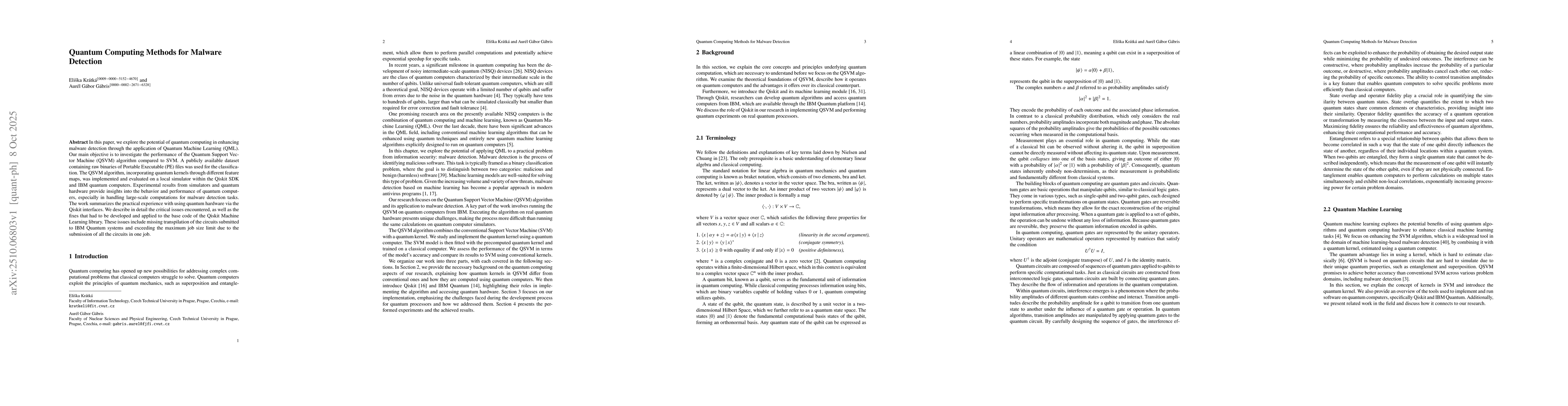 The research implemented quantum machine learning for malware detection using IBM Quantum systems, focusing on quantum kernel methods with feature maps like Pauli, Z, and ZZ. It addressed challenges in transpilation and job size constraints through custom fixes and evaluated performance on real quantum hardware.