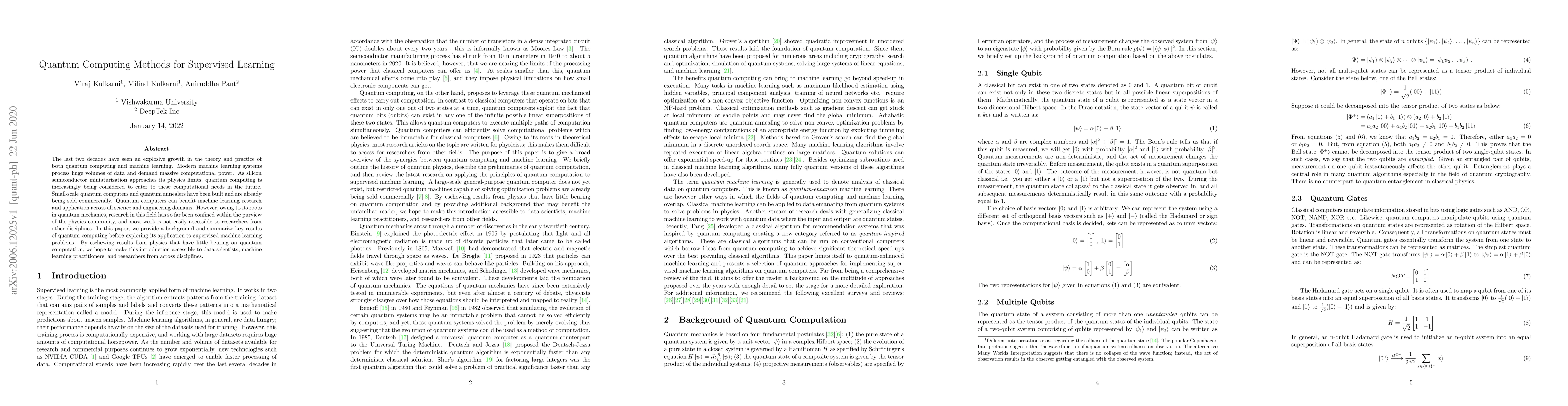 The last two decades have seen an explosive growth in the theory and practice of both quantum computing and machine learning. Modern machine learning systems process huge volumes of data and demand massive computational power. As silicon semiconductor miniaturization approaches its physics limits, quantum computing is increasingly being considered to cater to these computational needs in the future. Small-scale quantum computers and quantum annealers have been built and are already being sold commercially. Quantum computers can benefit machine learning research and application across all science and engineering domains. However, owing to its roots in quantum mechanics, research in this field has so far been confined within the purview of the physics community, and most work is not easily accessible to researchers from other disciplines. In this paper, we provide a background and summarize key results of quantum computing before exploring its application to supervised machine learning problems. By eschewing results from physics that have little bearing on quantum computation, we hope to make this introduction accessible to data scientists, machine learning practitioners, and researchers from across disciplines.
