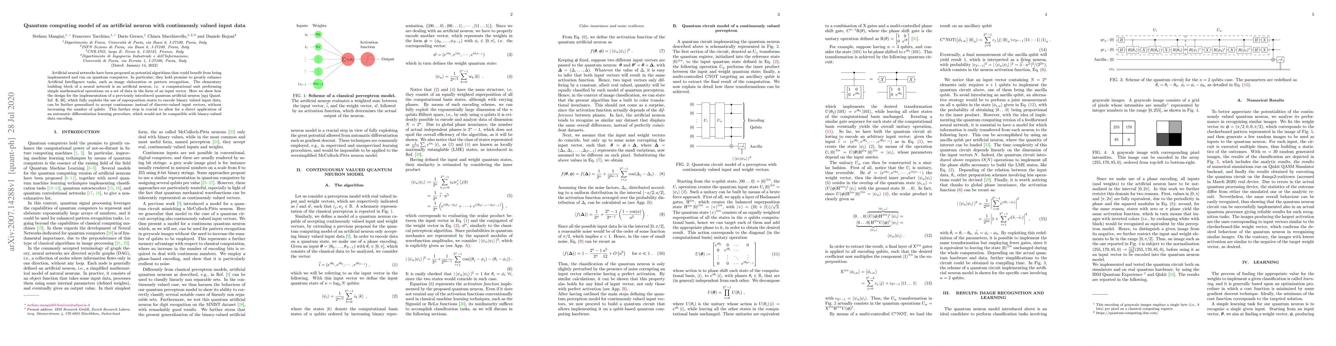 This paper proposes a quantum computing model for an artificial neuron capable of processing continuous-valued input data, extending a previous model for binary inputs. This generalization enables the application of automatic differentiation learning procedures, enhancing potential quantum implementations for AI tasks like image processing and pattern recognition.