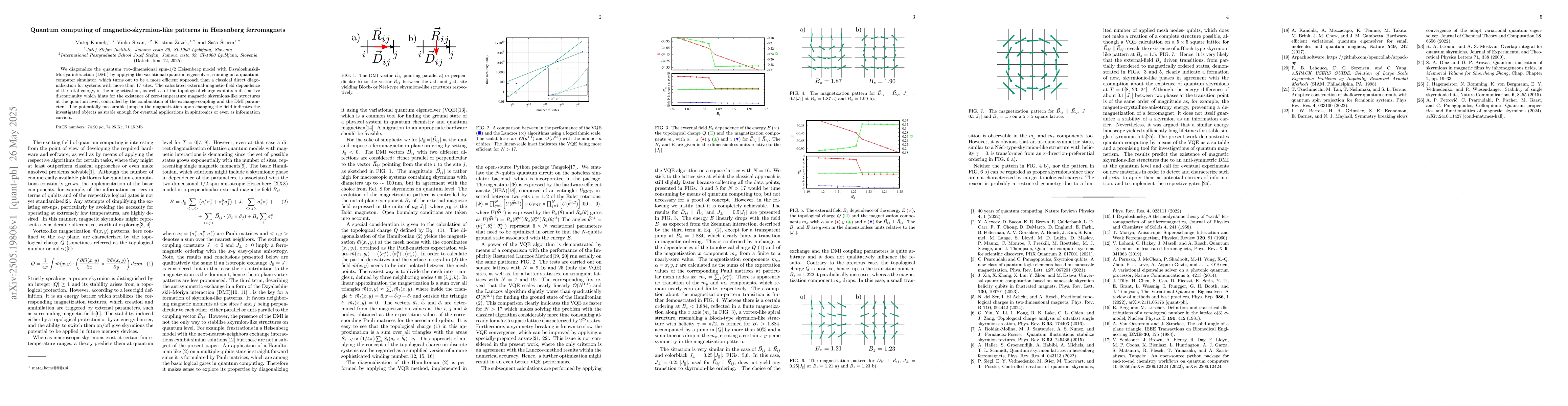 The research diagonalizes the quantum two-dimensional spin-1/2 Heisenberg model with Dzyaloshinskii-Moriya interaction (DMI) using the variational quantum eigensolver, executed on a quantum-computer simulator. This method proves more efficient than classical direct diagonalization for systems with more than 17 sites.