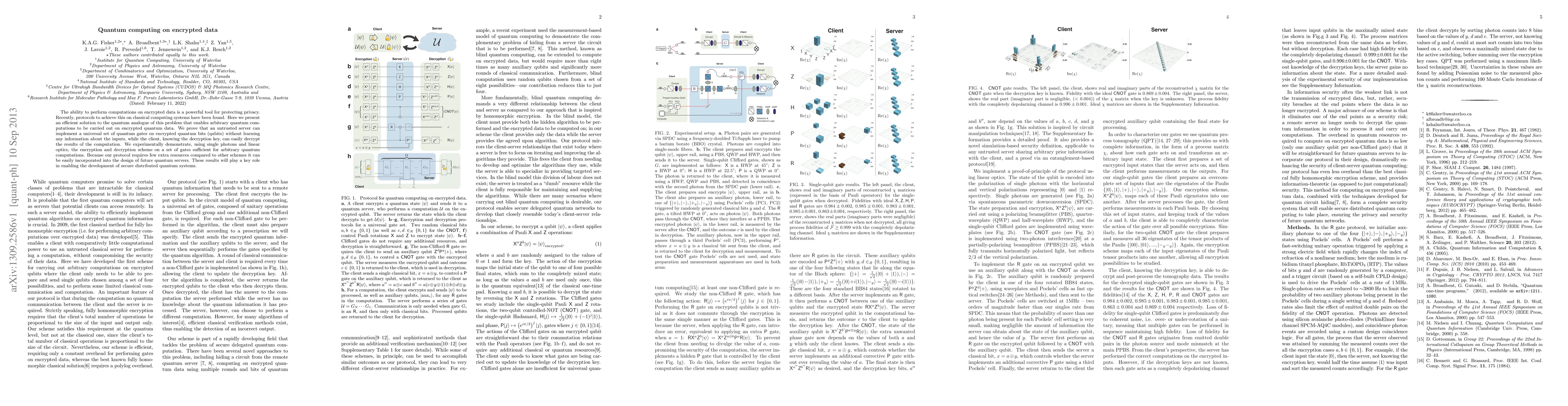 The research presents an experimental demonstration of quantum computing on encrypted data using single photons and linear optics, implementing a universal set of quantum gates on encrypted qubits without revealing any information to an untrusted server.